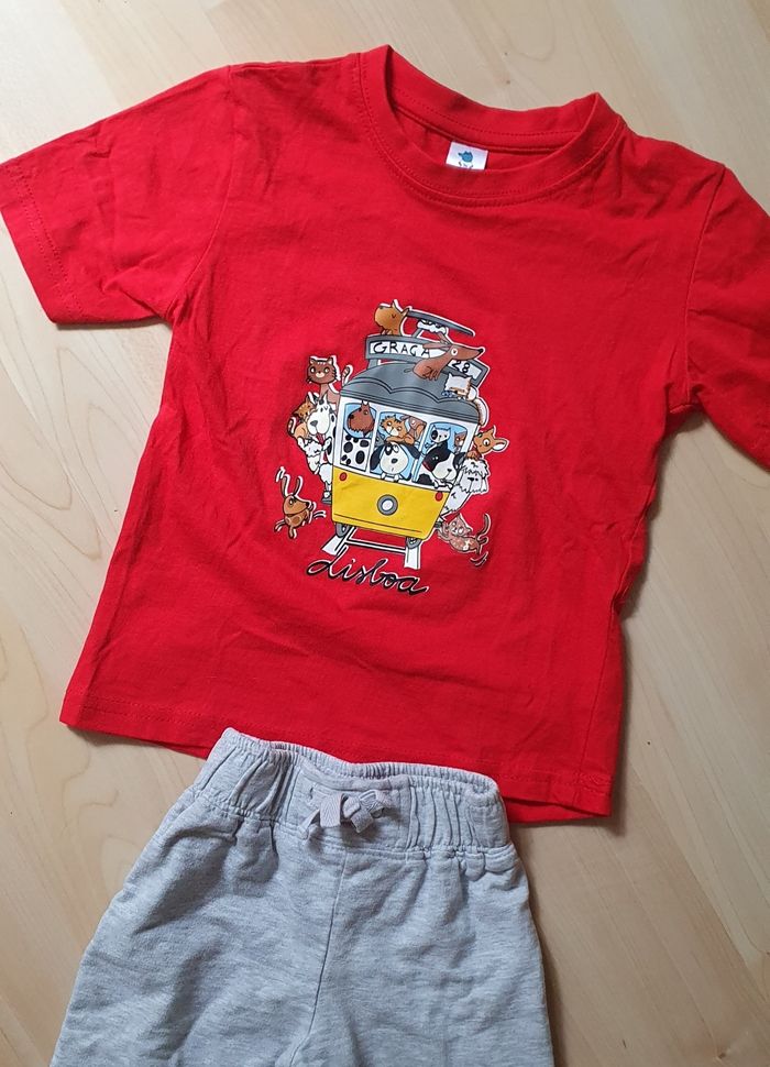 Tee-shirt rouge à manches courtes avec dessin tramway🚊, chiens/chats et imprimé noir "Lisboa" sur l'avant. T. 1-2 ans. De marque M. Wolf. + Bas de survêtement gris clair. T. 18 mois. De marque Tex Baby. Ensemble de vêtements porté 1 ou 2 fois seulement! Comme neufs.