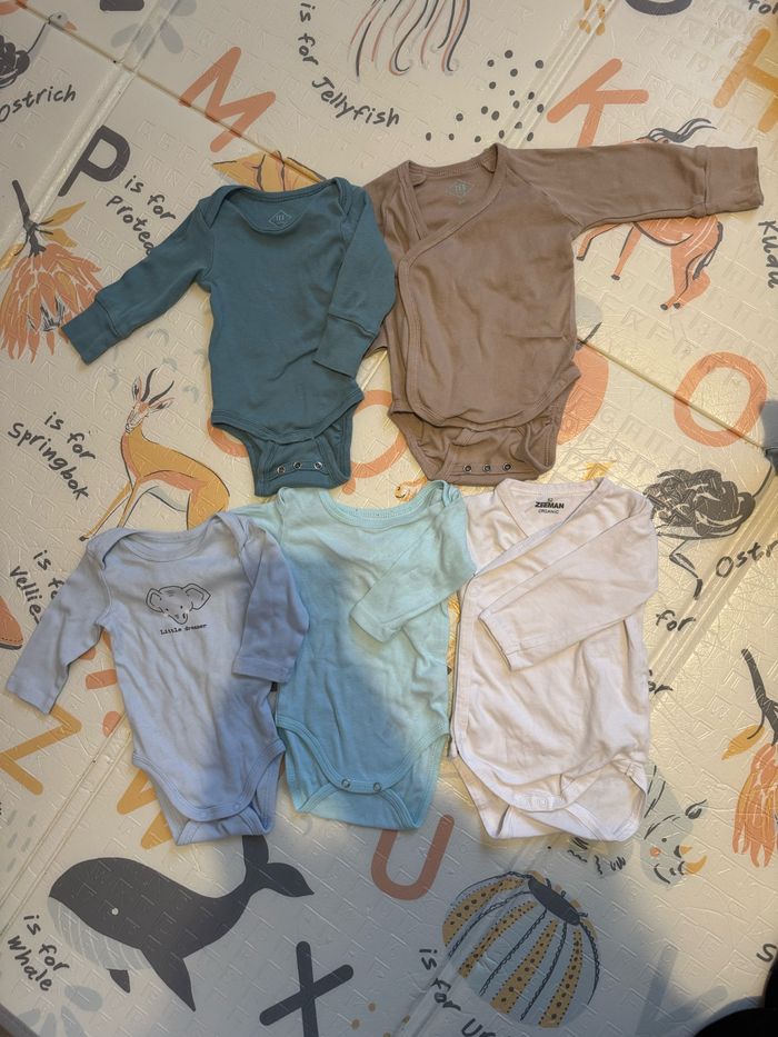 Lot de 5 bodys dont 2 évolutif jusqu'au 6 mois Très bon état . Maison non fumeur Envoie rapide