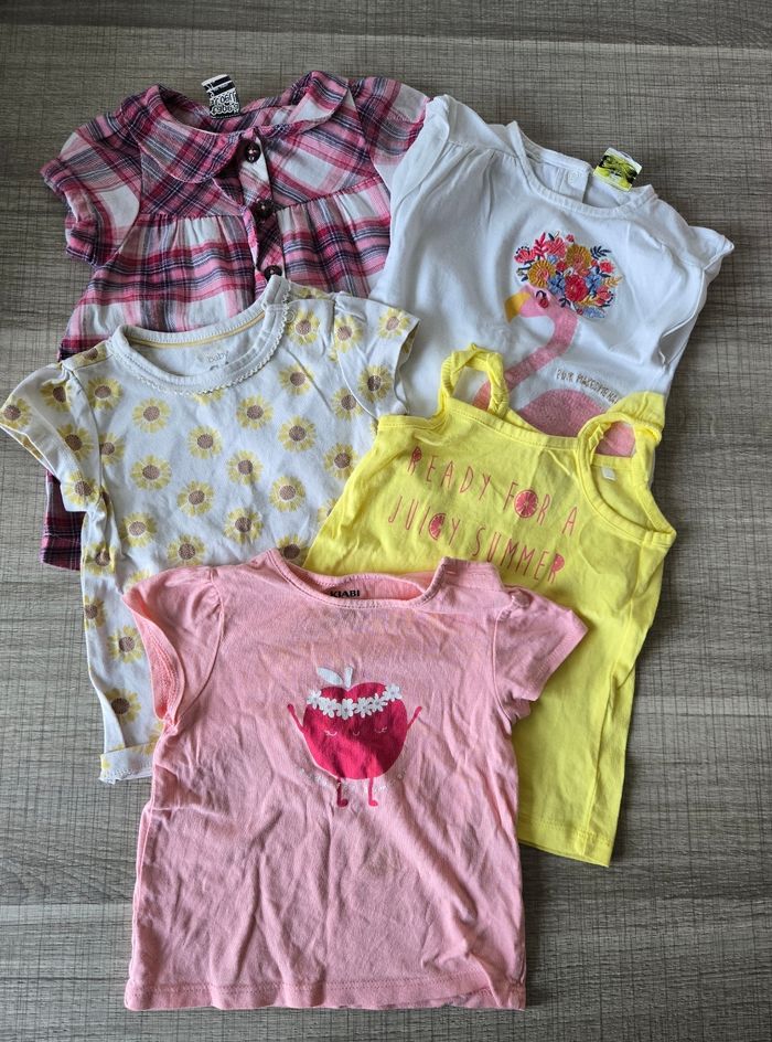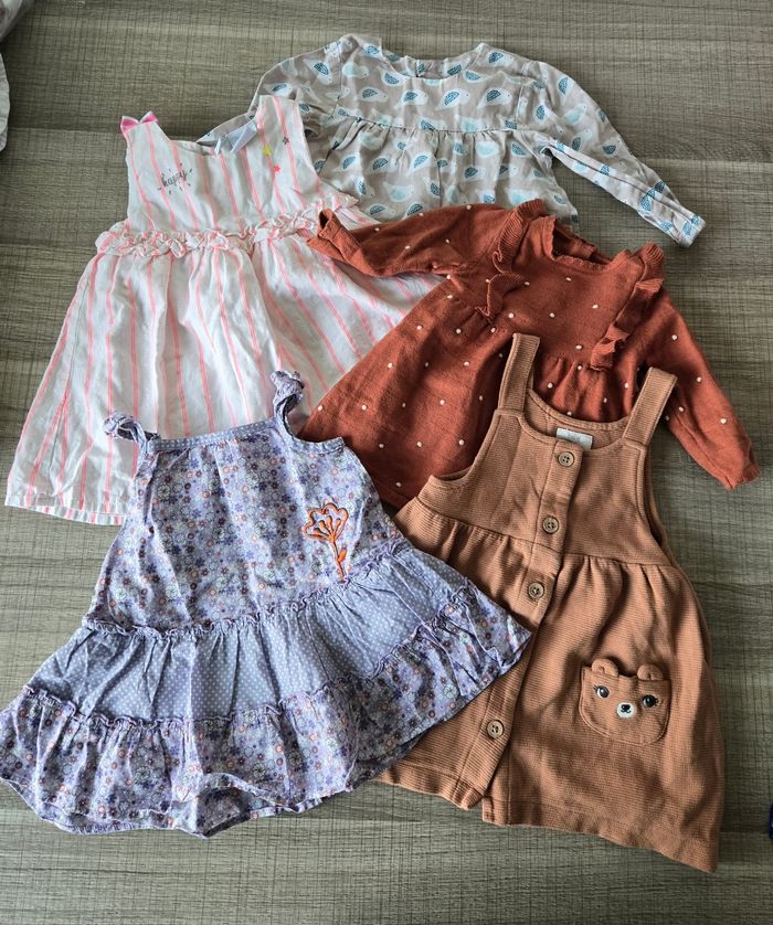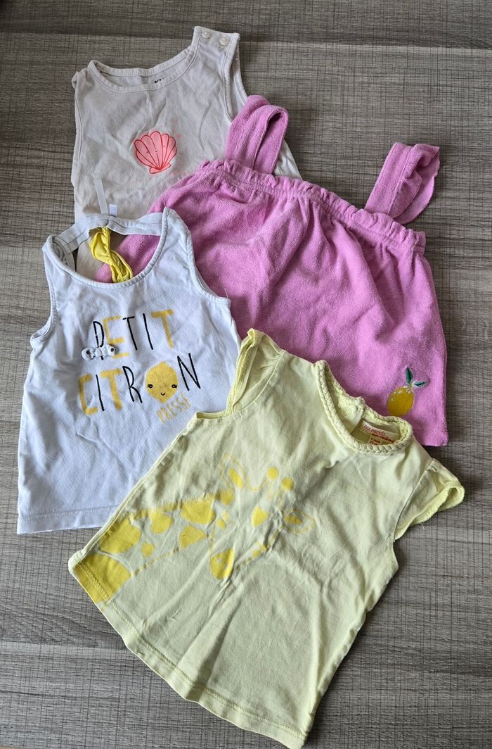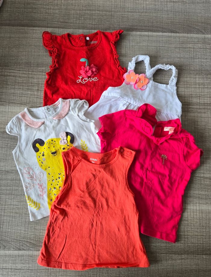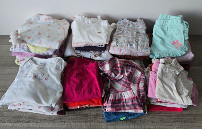 Gros lot fille 9 mois printemps été (tout n'est pas en photo car pas assez de place) Le lot est composé de vetement en bon état : 4 pantalons 2 shorts 1 leggings 9 hauts à manches longues (le DPAM rose est tâché en haut) 14 T shirt (le rose kiabi avec la pomme est tâché au col) 2 barboteuses 5 robes 1 tenue complète (body + pantalon léger + bandeau) 6 pyjamas légers 8 body manches longues