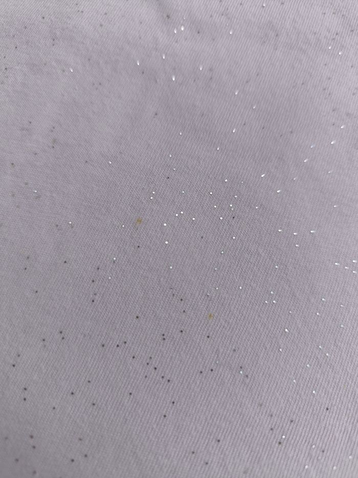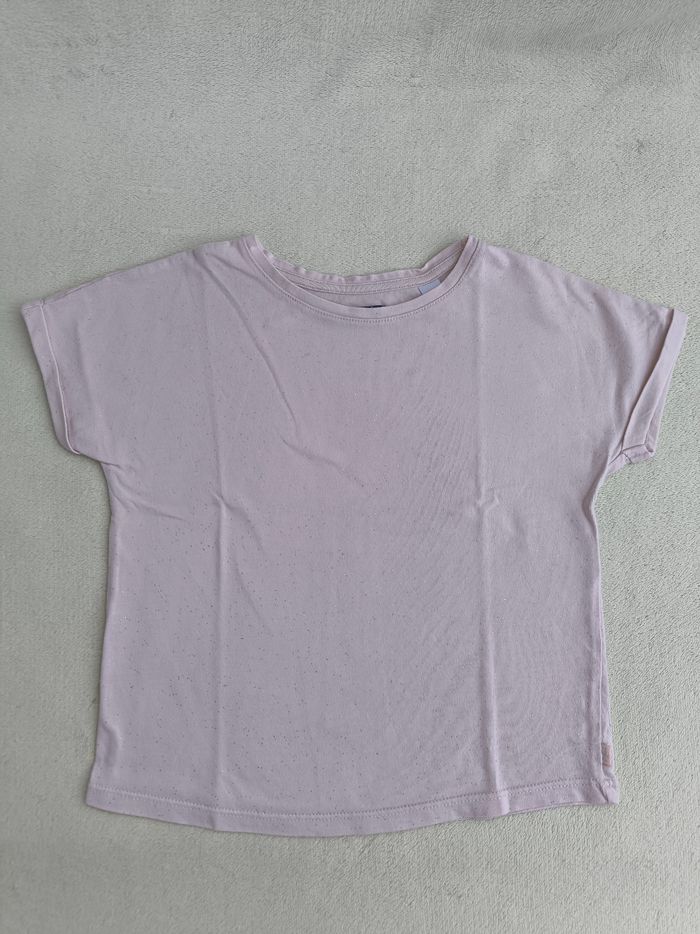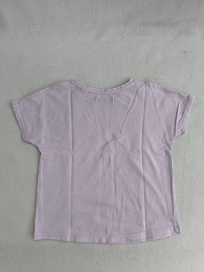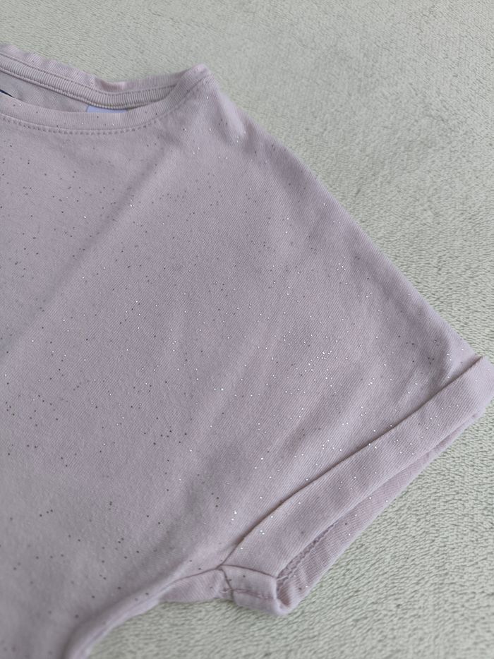 T-shirt à manches courtes Marque Okaïdi Taille 6 ans, 116 cm • Coloris lila pâle, argenté • Paillettes argentées • Tissu fin • Petites taches à l'avant En très bon état #evelyne_filles_6ans #evelyne_filles