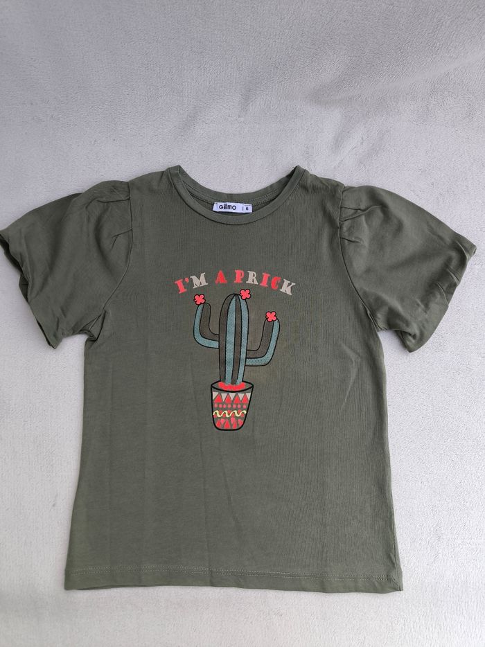 T-shirt à manches courtes Marque Gémo Taille 6 ans • Coloris kaki • Motif cactus, inscription "I'm a prick" • Manches ballonné avec fronces • Coton fin Comme neuf #evelyne_filles_6ans #evelyne_filles
