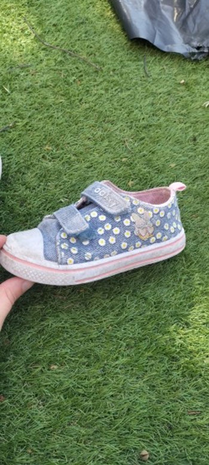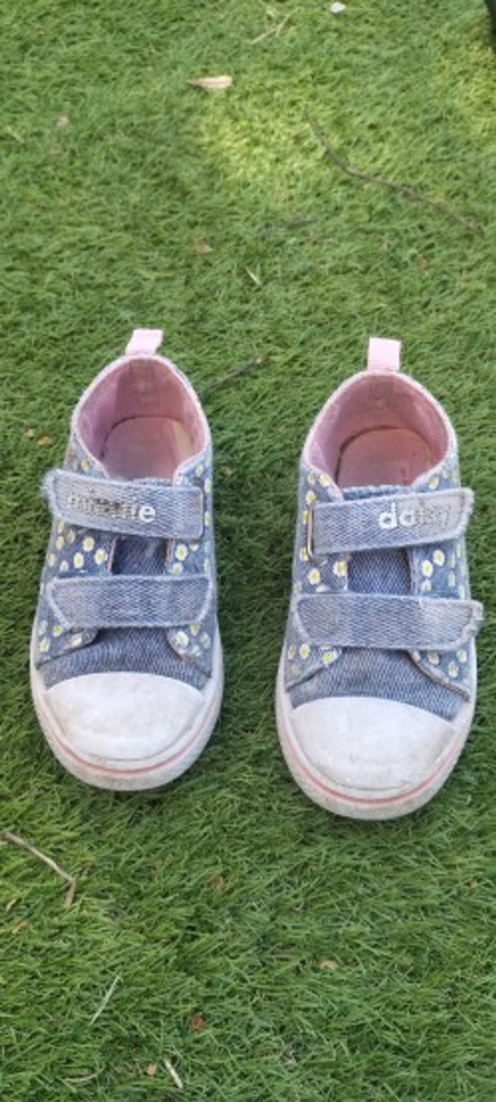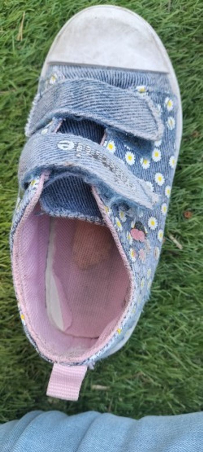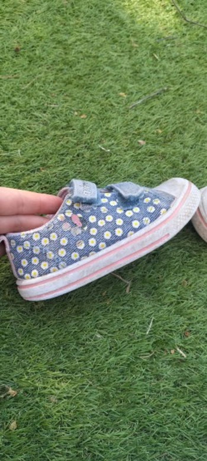 basket en toile, a scratch Taille 25 bleu motif fleures, Minie et Saisie sur chache chaussures (mais effacer, voir photo) Bien porter, semelle user, mais peuvent encore être porter