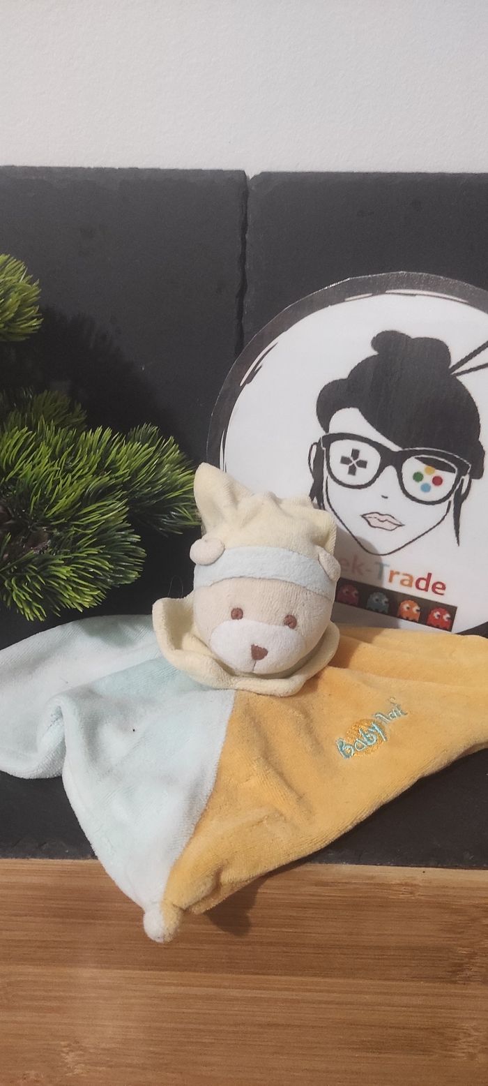 Doudou plat ours orange bleu jaune baby nat ancien bonnet carré colerette Noeud - photo numéro 1