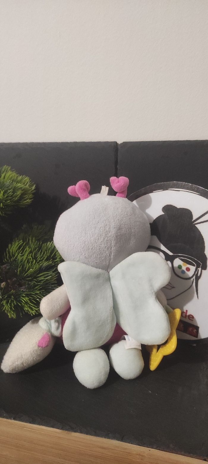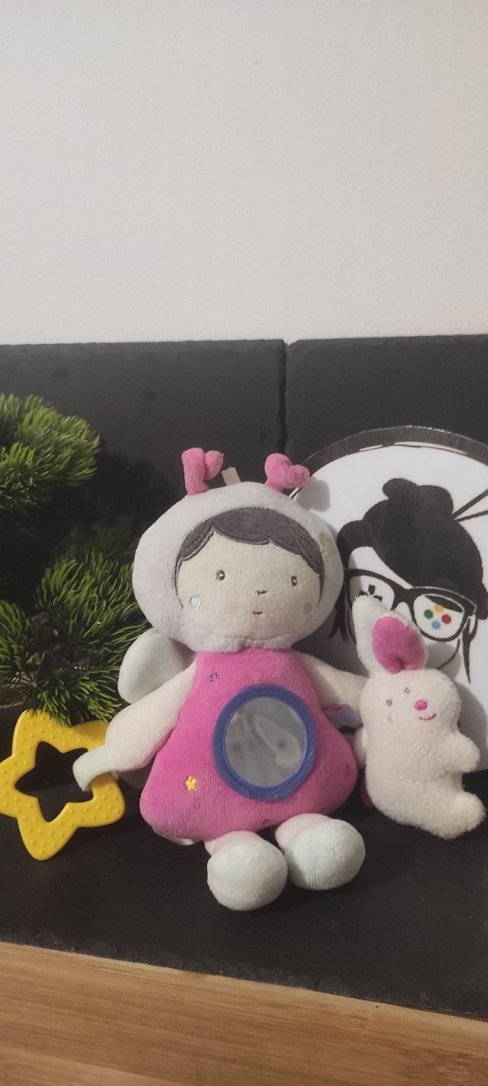 Doudou peluche fille déguisée papillon fee lapin etoile activité jaune rose miroir sucre d'orge