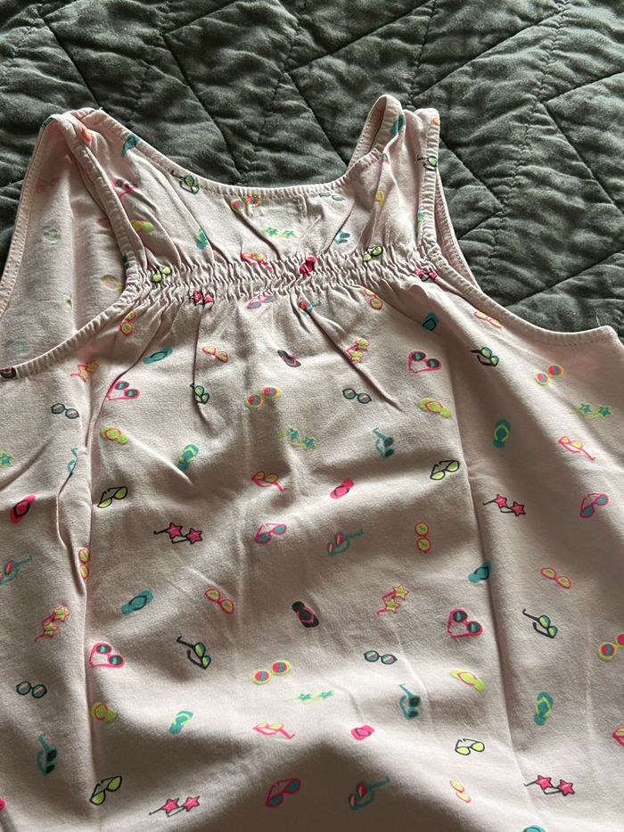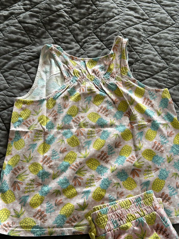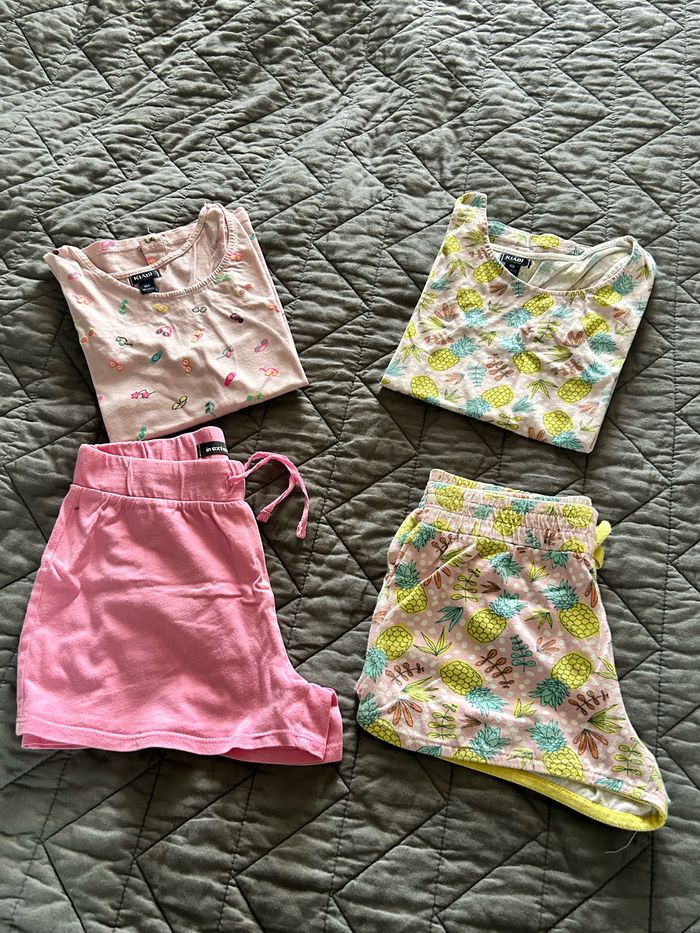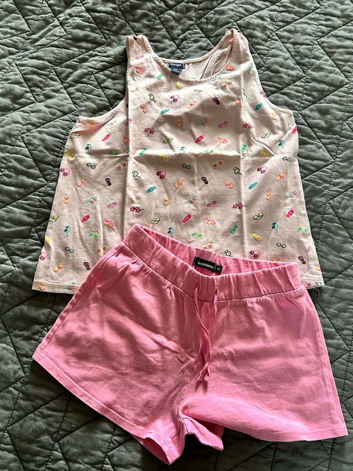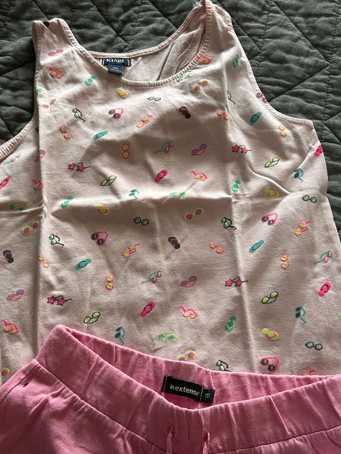 Lot de 2 ensembles shorts et t-shirts à bretelles larges taille 10 ans de la marque Kiabi. -1 couleur rose clair avec motifs ananas. -1 t-shirt rose clair avec motifs lunettes tongs et short rose plus foncé (marque Inextenso). Idéal pour la piscine ou plage. Portés mais encore en bon état.