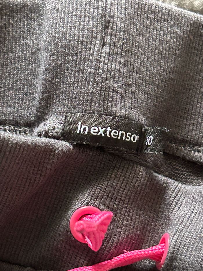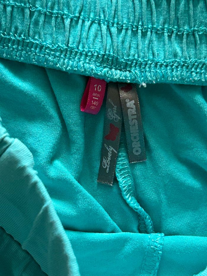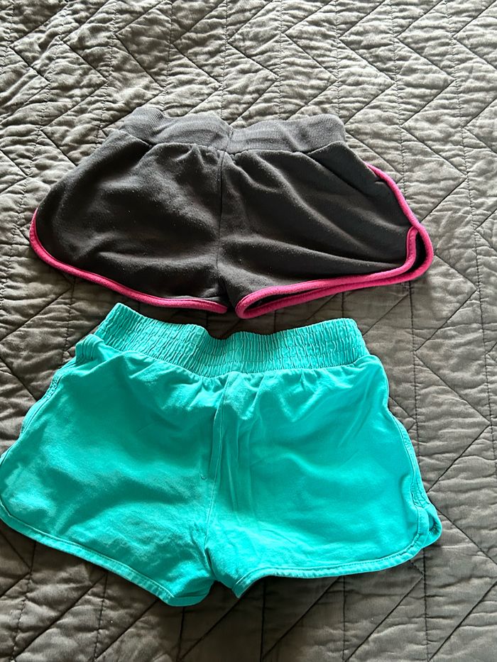 Lot de 2 shorts courts sport, taille 10 ans fille. -1 bleu turquoise, léger, de la marque « Orchestra ». -1 gris anthracite et liserais rose fuchsia en matière jogging épais, de la marque « Inextenso ». En très bon état.