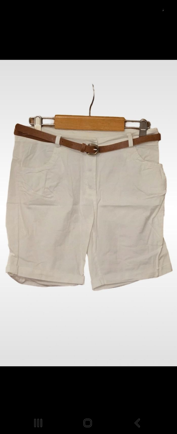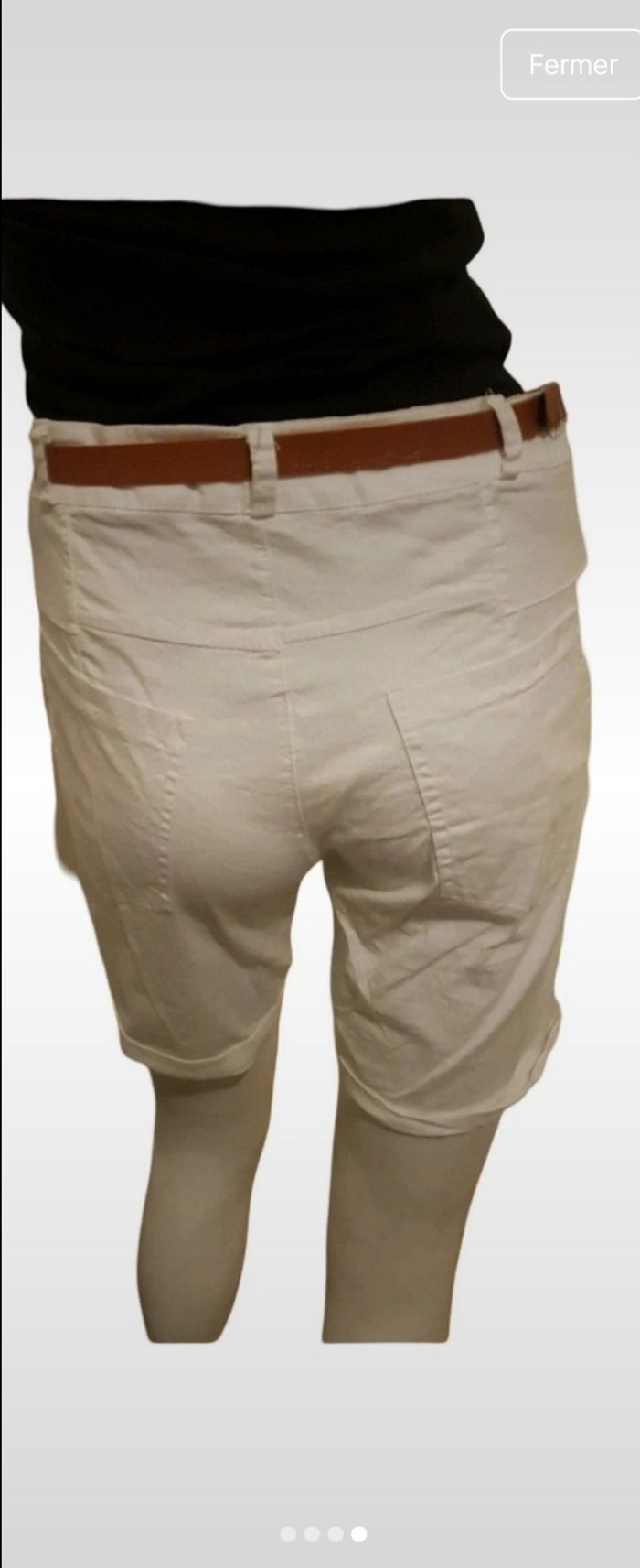 Short femme blanc made in italy T.XXL Short blanc avec poche devant et derrière,ourlet bas de jambe .ceinture . 97% coton 3 % elasthane . Prix 16€