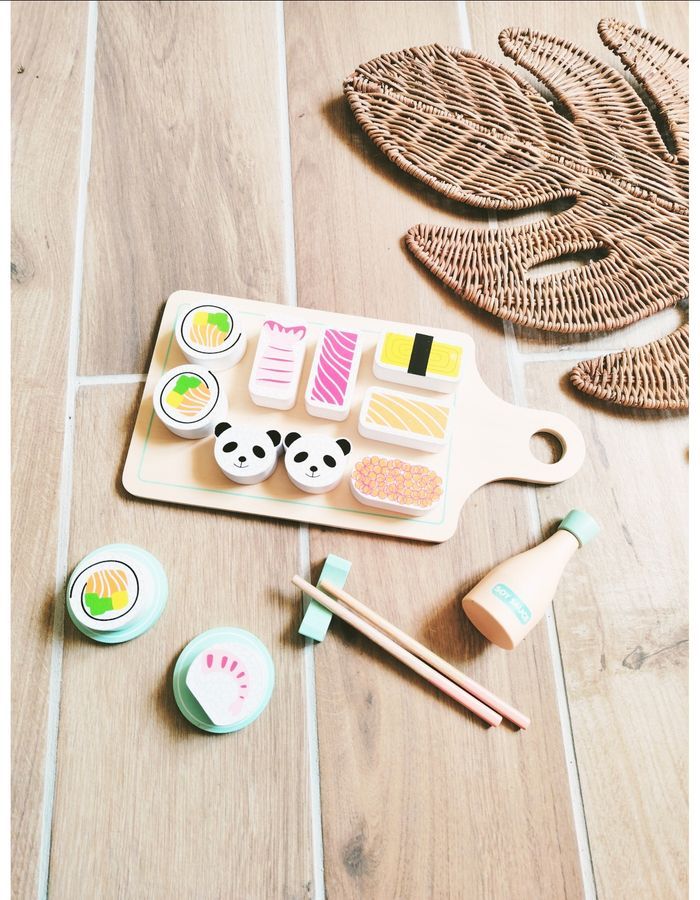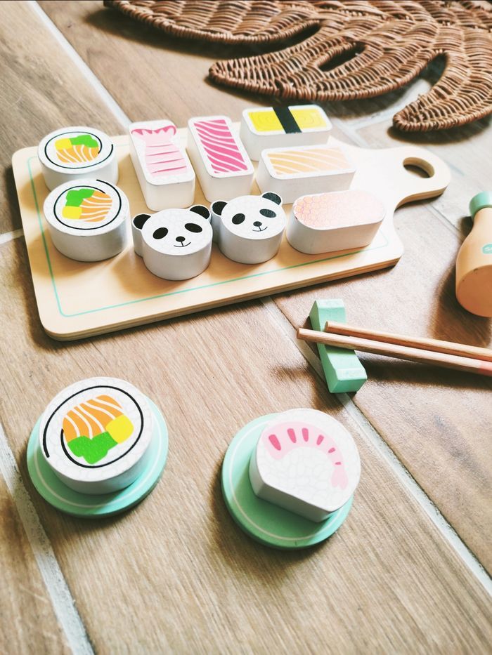 🎀Invitez le Japon dans la chambre de votre enfant avec ce magnifique plateau de sushis en bois ! Un set complet et ludique, parfait pour développer l'imagination et la dextérité (manipulation des baguettes).