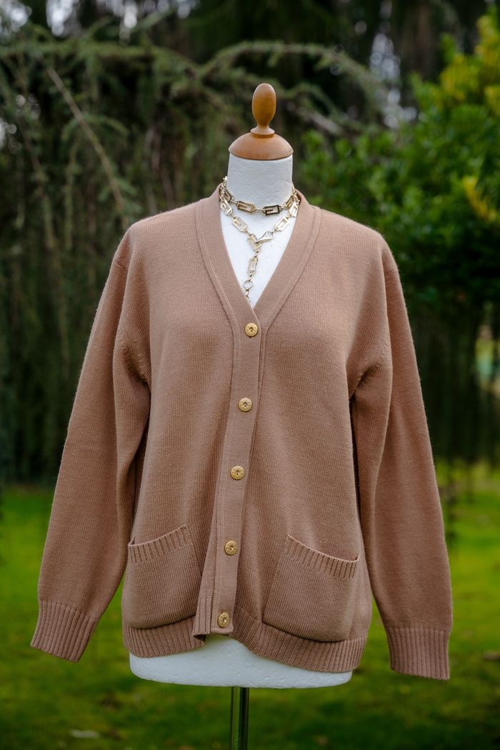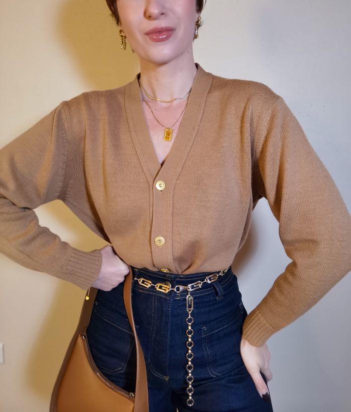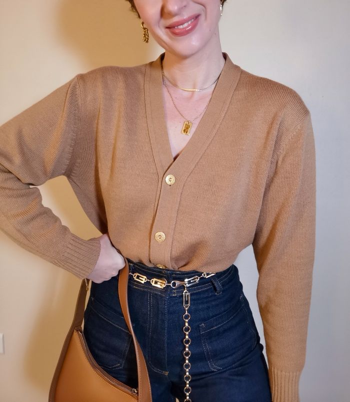 Cardigan beige boutons dorés, pas d'étiquette de compo, surement un mélange acrylique laine. Ok du 36 au 40 selon l'effet loose. Je fais 1,76m pour un 38. Dimensions à plat: épaules 50cm, poitrine 52cm, longueur 63cm #cardigan #cardigan36 #cardigan38 #cardigan40 #cardiganlaine #cardiganbeige #cardiganchic