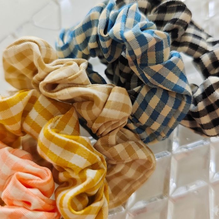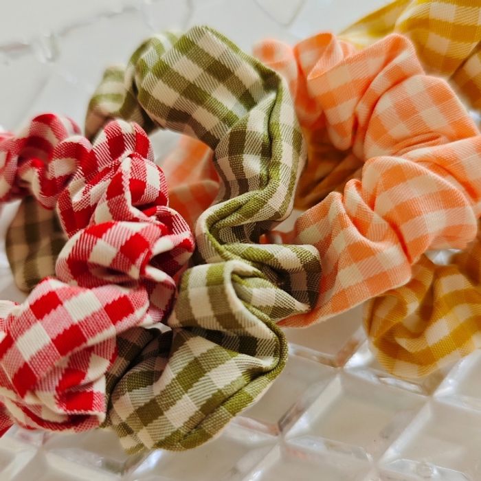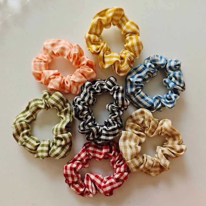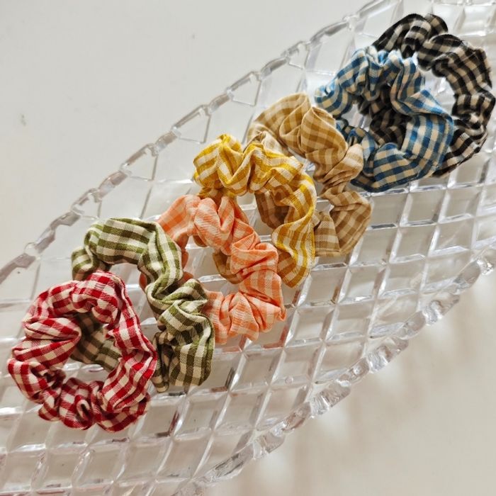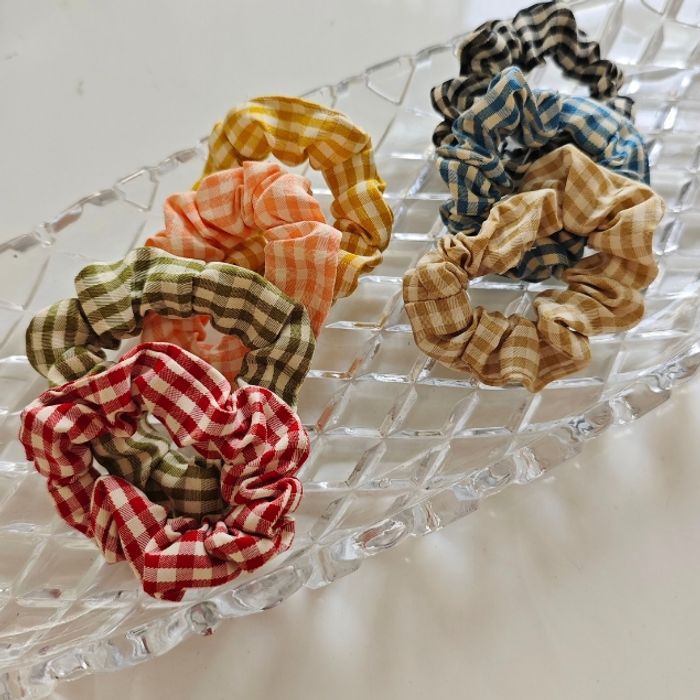 Mini chouchou LescinqL tissus vichy. Il est disponible enorange, jaune,bleu, marron, rouge,vert et noir . Indiquez moi quel couleur vous souhaitez dans votre commande. Pour un style chic et raffiné. Osez-vous offrir un accessoire fait main avec amour et passion LescinqL.
