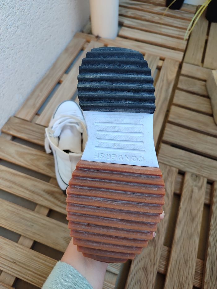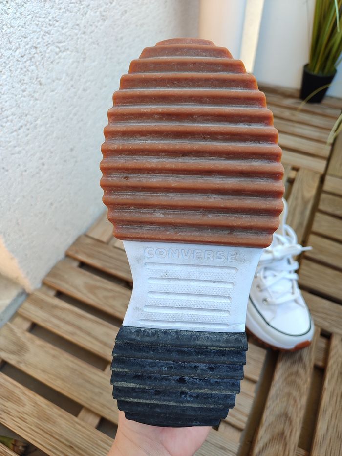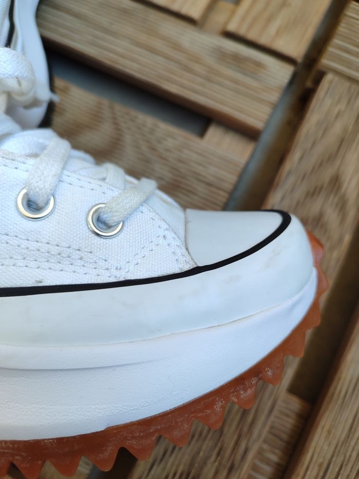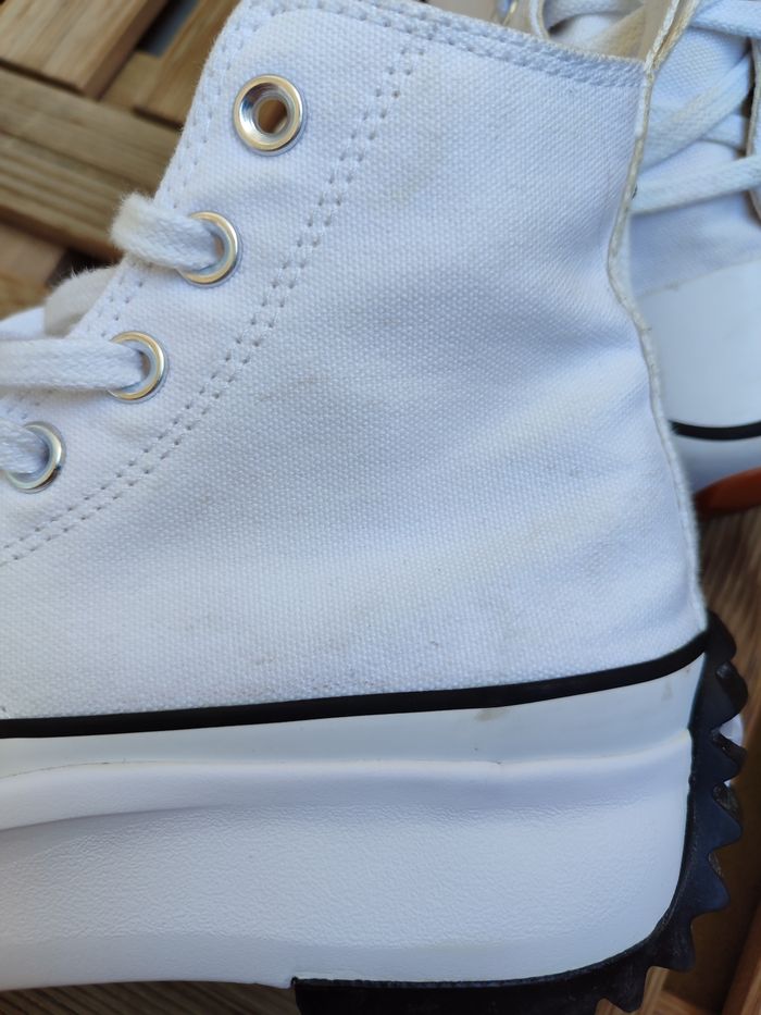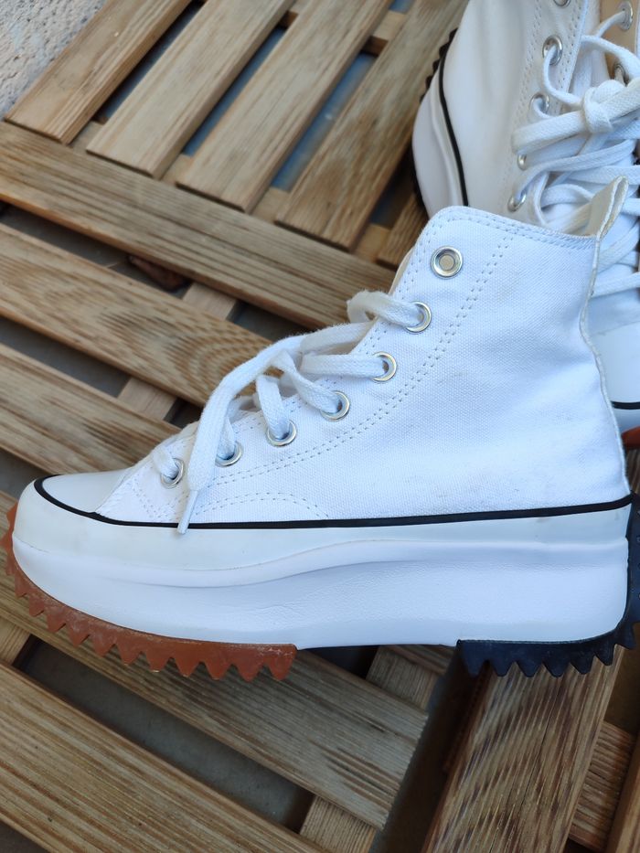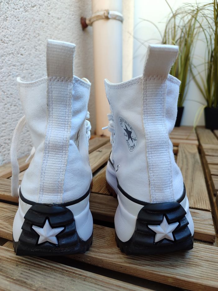 A vendre une paire de converse plateforme Run Star hike blanche taille 36 authentique pas de contrefaçon. Chaussures mises 2,3 fois il y a donc quelques petites marques mais rien de choquant. Aucun signe d'usure juste des traces noir comme sur beaucoup de paire de baskets. Il y a aussi une tâche sur la languette à voir sur la photo. Chaussures jamais passées en machine à laver! Je reste disponible pour toutes questions supplémentaires ou photos. Envoie dans un carton, photo à l'appui. Je n'ai plus la boîte, ni le ticket de caisse. Pépite 🧡