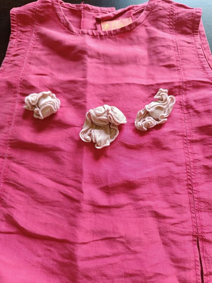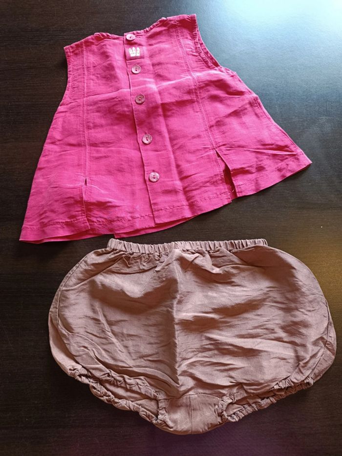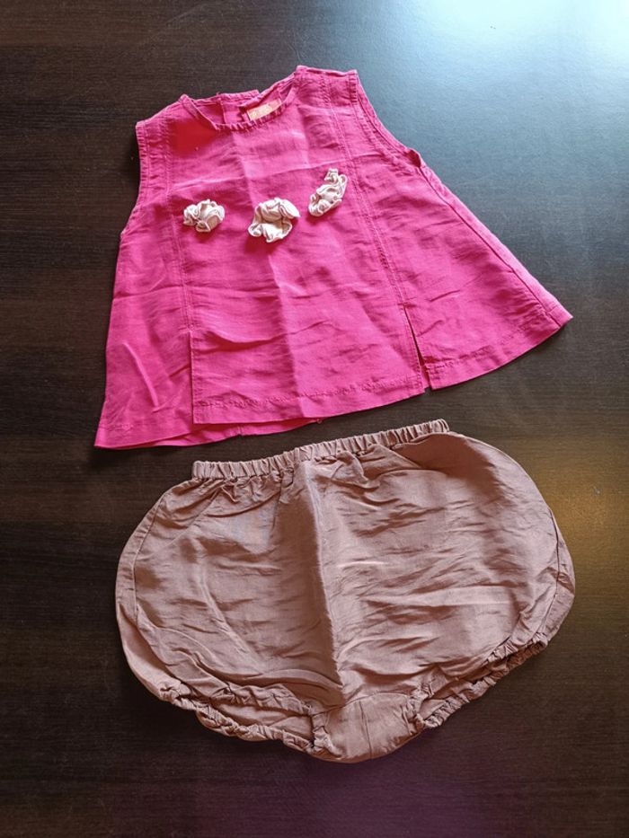 Ensemble IL ÉTAIT UNE FÉE Comprends: 1 haut rose avec fleurs en relief rose clair Fermé par boutons griffés dans le dos Vignette griffée sur l'arrière & 1 bloomer Taille élastiqué 100% Soie TAILLE 12 MOIS TRES BON ETAT Allez voir mes autres ventes!