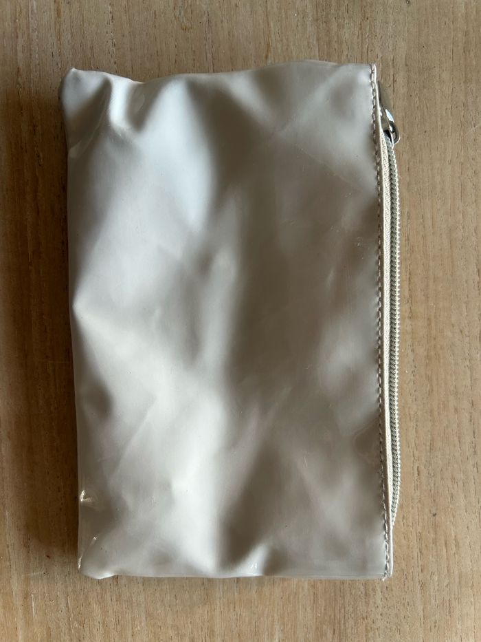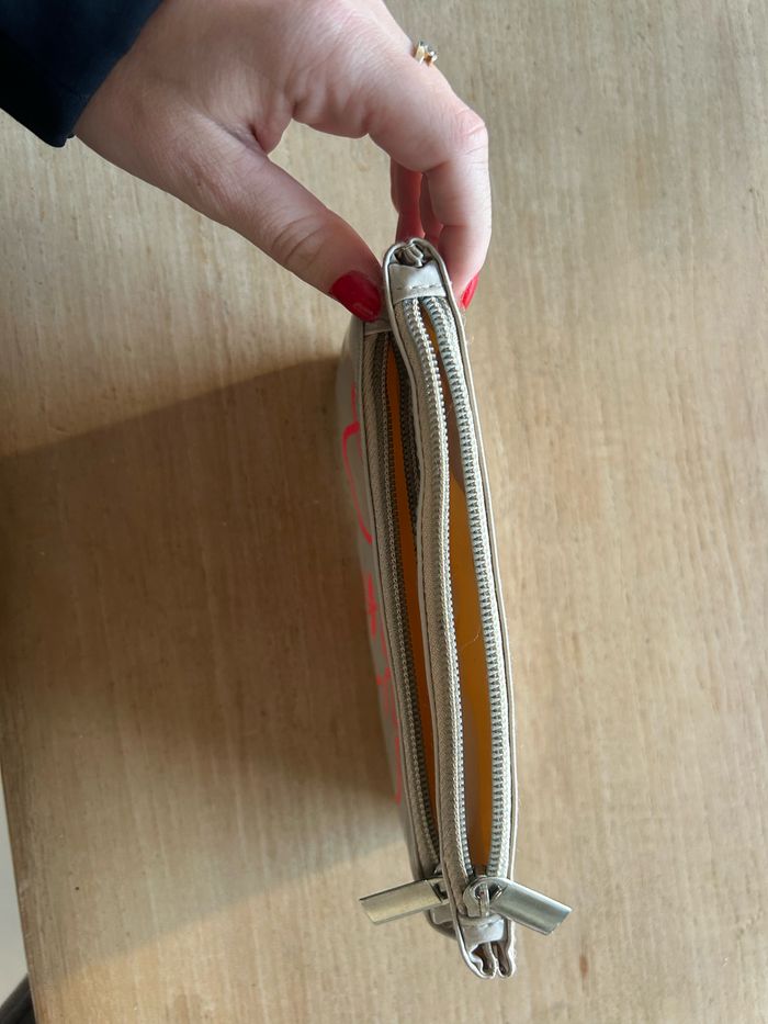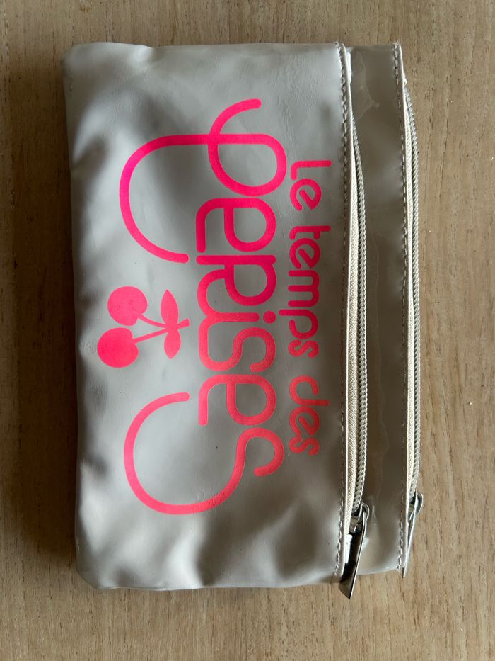 Pochette originale de la marque Le Temps des Cerises, en simili cuir beige avec inscription rose fluo sur le devant. Motif cerises emblématique de la marque. Dotée de deux compartiments zippés pour un rangement pratique. Idéale pour maquillage, stylos ou petits accessoires.
