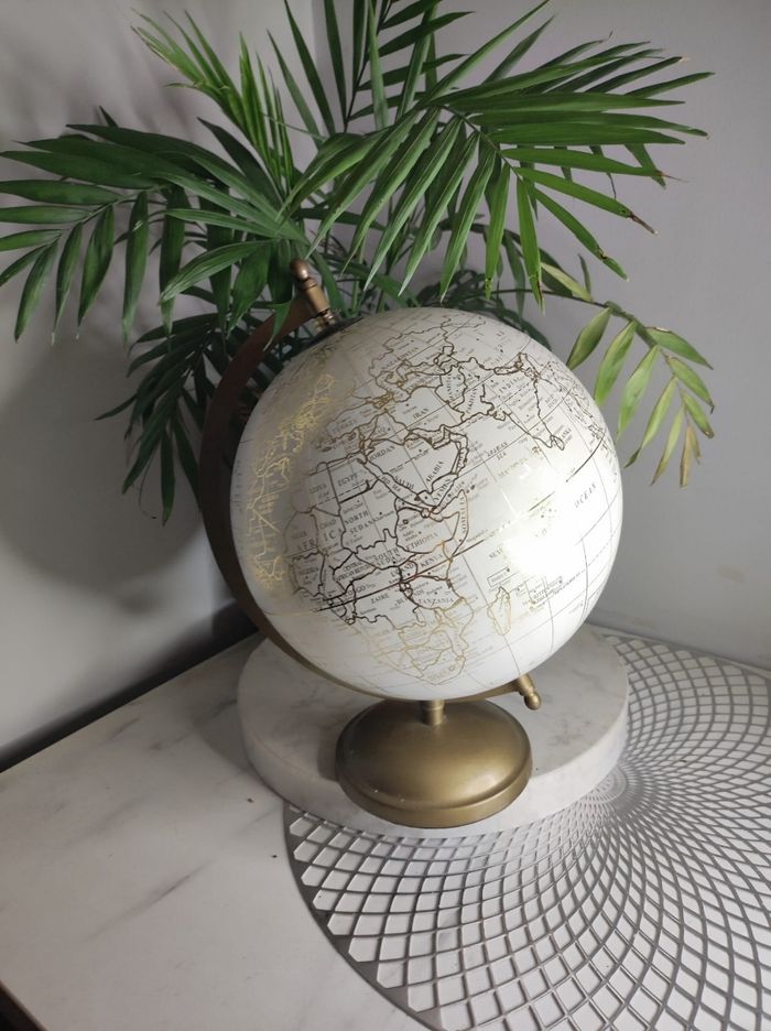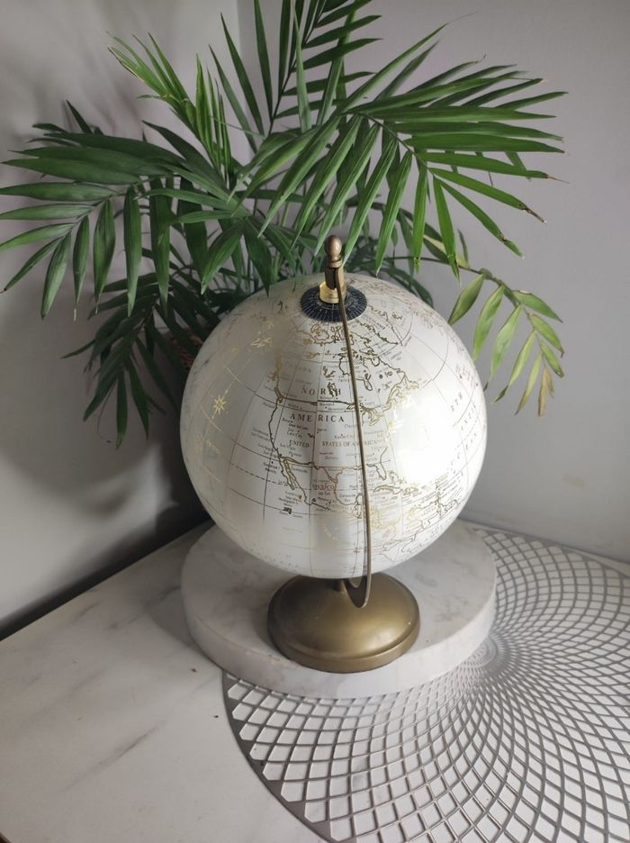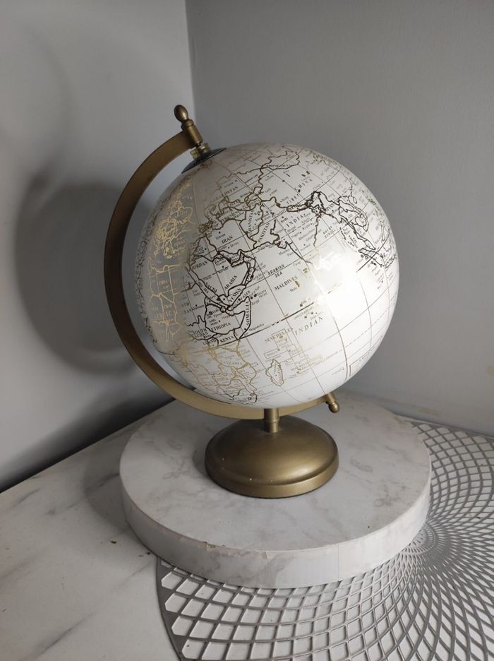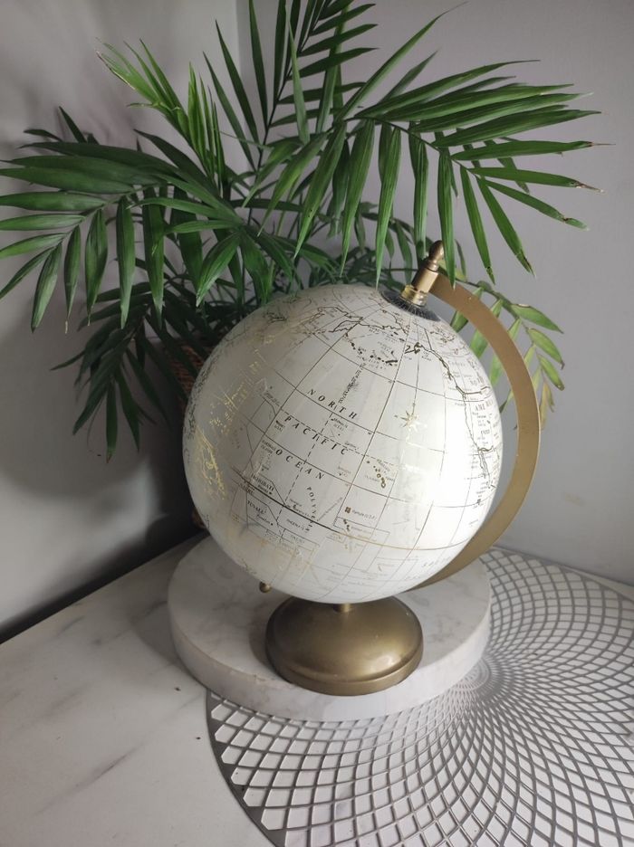 Magnifique globe terrestre qui apportera une touche d'élégance à votre intérieur. Avec son design classique et ses détails dorés, ce globe est un accessoire décoratif intemporel. Il mesure environ 17cm de diamètreet 30 cm de haut, se tient sur un socle doré. Cet objet de décoration est en bon état et ajoutera une note de sophistication à votre espace de travail ou de loisirs. C'est un bel objet à la fois fonctionnel et esthétique qui fera le bonheur de tout amateur de géographie et de voyages. Quelques traces d'usage du temps ( cf photos ). Maison du monde.