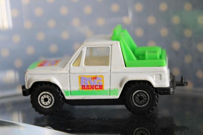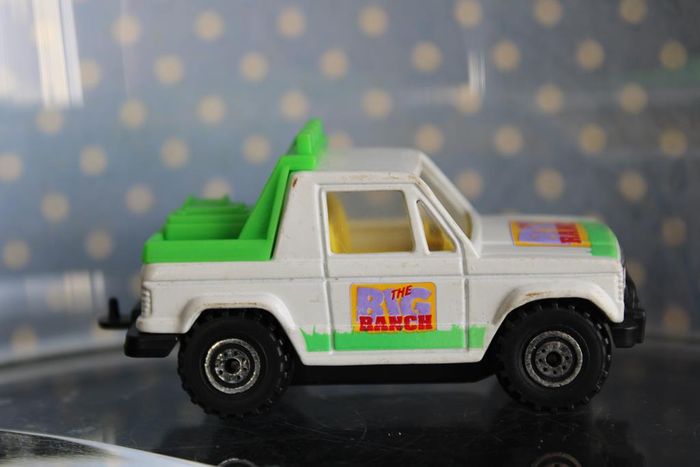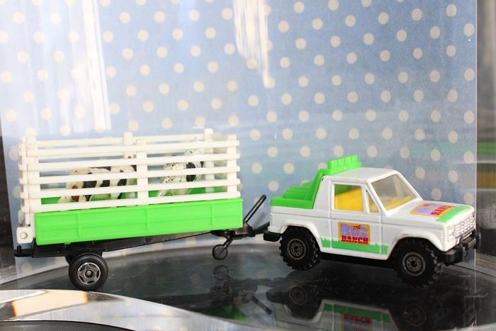 Voiture miniature plus remorque bétaillère Couleur : Blanc et vert et stickers "big ranch" Chassis : Plastique noir Longueur : Environ 15 cm avec la bétaillère Fabriqué en Chine Voiture en bon état. Pas de manque de peinture. Pas de casse. Bel aspect des stickers Remorque en plastique. En bon état, elle s'ouvre à l'arrière. la roue jockey se déplie. Pas de casse Avec 2 figurines vaches. Réponds avec plaisir aux demandes d'informations complémentairre Réponse rapide Envoi soigné dans les meilleurs délais