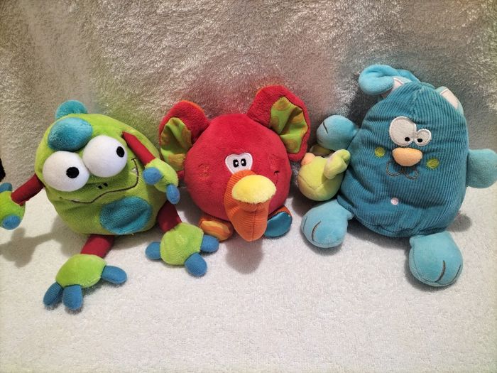 Voici un lot de 3 adorables peluches doudou pour bébé. Ces petits compagnons sont parfaits pour câliner et réconforter les tout-petits. Ils sont doux et moelleux, avec des couleurs vives et des expressions amusantes qui plairont sûrement à votre bambin. Idéal pour la maison, la crèche ou les voyages, ces doudous feront le bonheur de votre enfant. N'hésitez pas à me contacter si vous avez d'autres questions ! - Lot de 3 peluches doudou bébé - Matériaux doux et moelleux - Couleurs vives et expressions amusantes - Parfait pour la maison, la crèche ou les voyages - Idéal pour câliner et réconforter les tout-petits - Très bon état - Marque Sur photo 2 et 3 - Le lot 5€