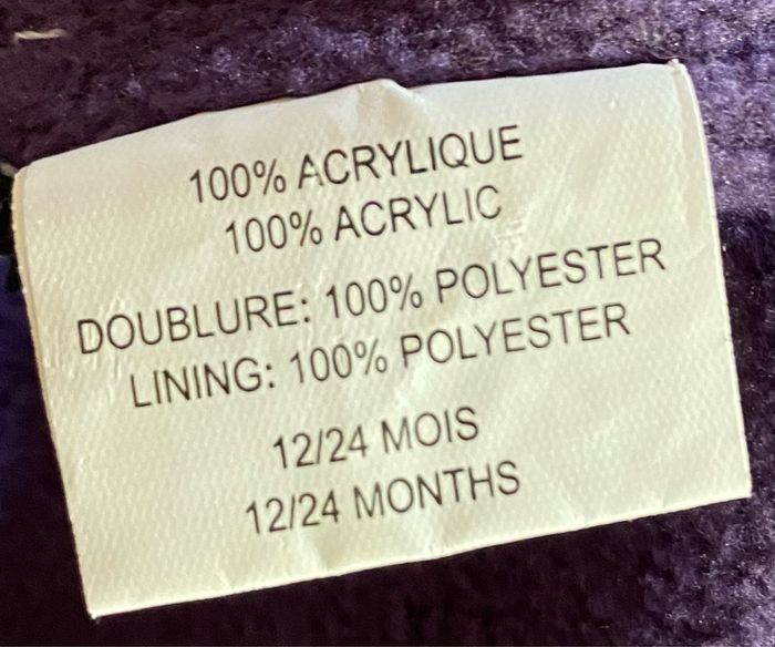 Bonnet avec doublure. Avec cash oreilles. 100 % acrylique au-dessus du bonnet et la doublure et à 100 % Polyester Taille 12/24 mois