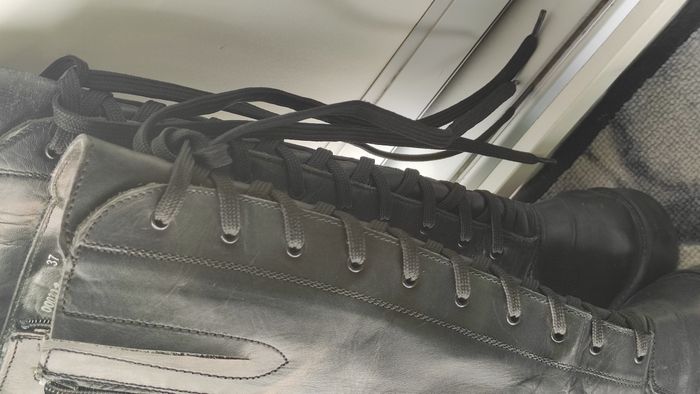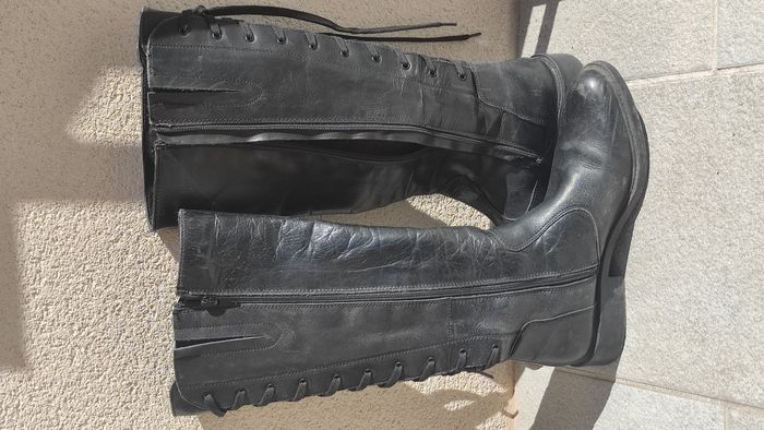 Vends botte haute.porte quelquefois .Ce ferme par fermeture éclair.A l arrière des lacets.talon 3 cm. Un peu usé