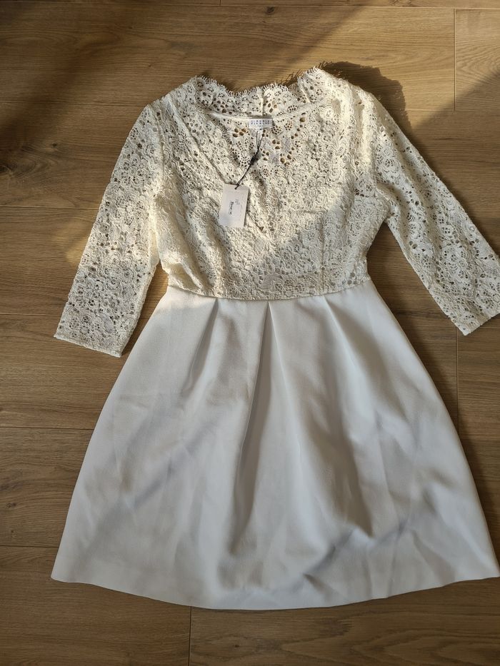 Magnifique robe Claudie Pierlot, modèle Rossana. Taille 38 neuve avec étiquette. Dentelle, très belle matière. Parfaite pour un mariage civile, une cérémonie, un bapteme, en 2eme robe après cérémonie.