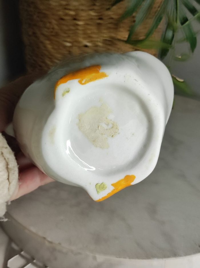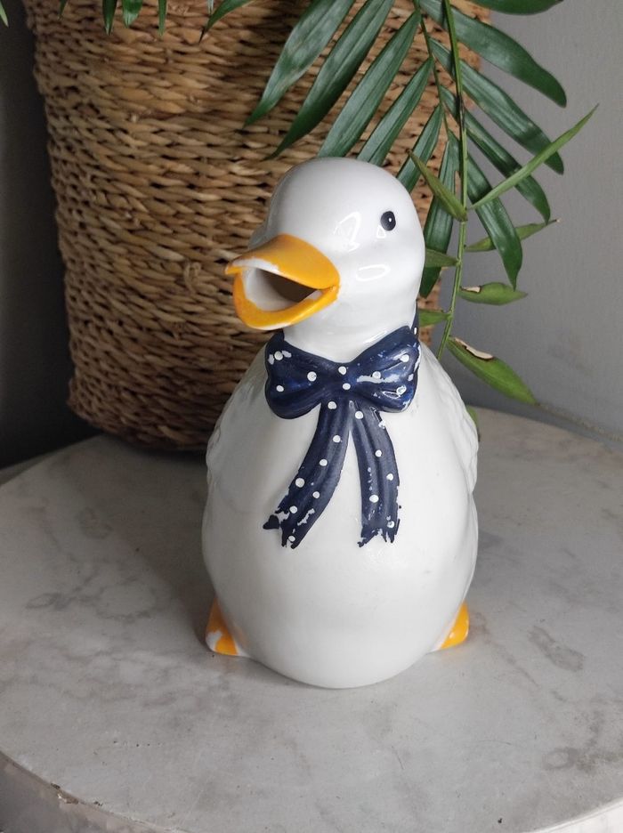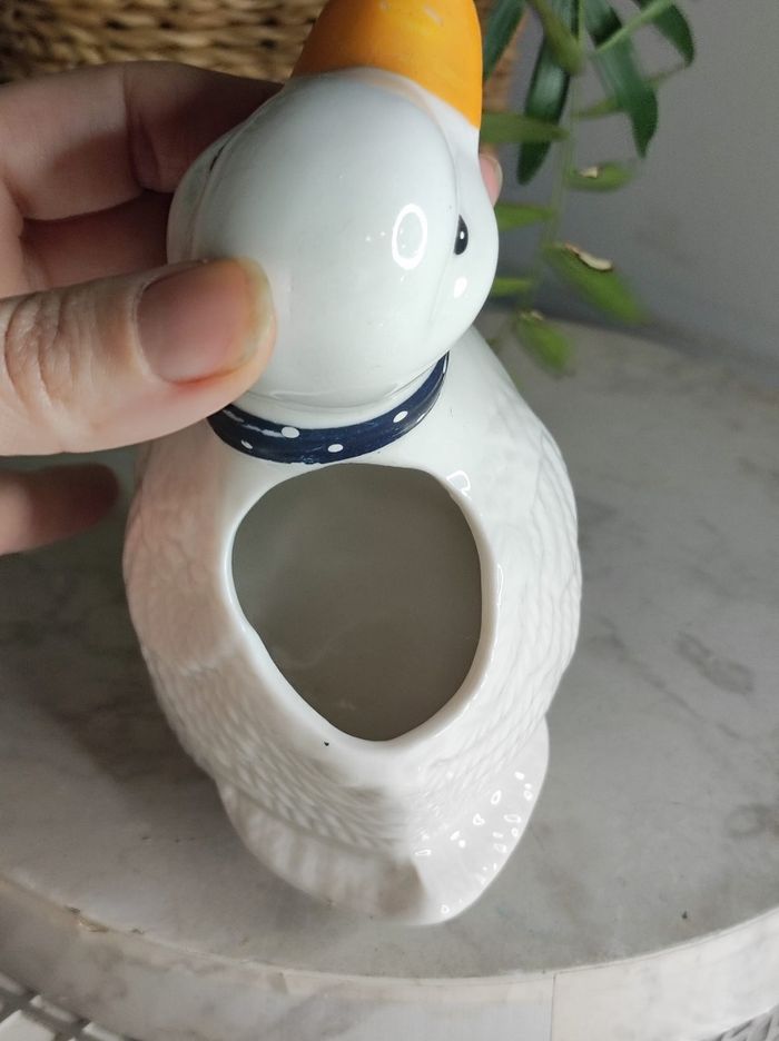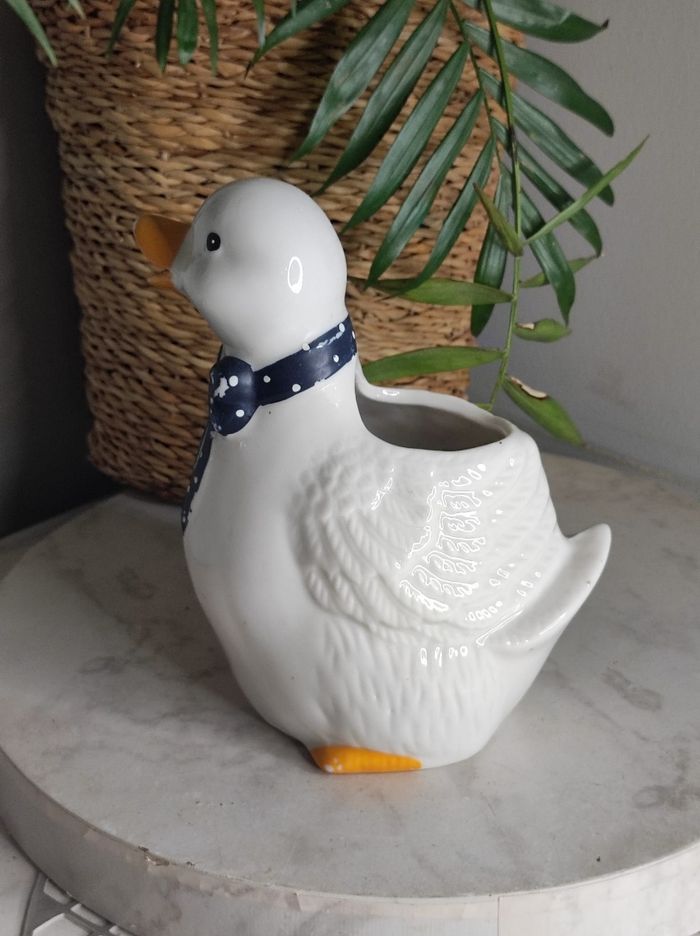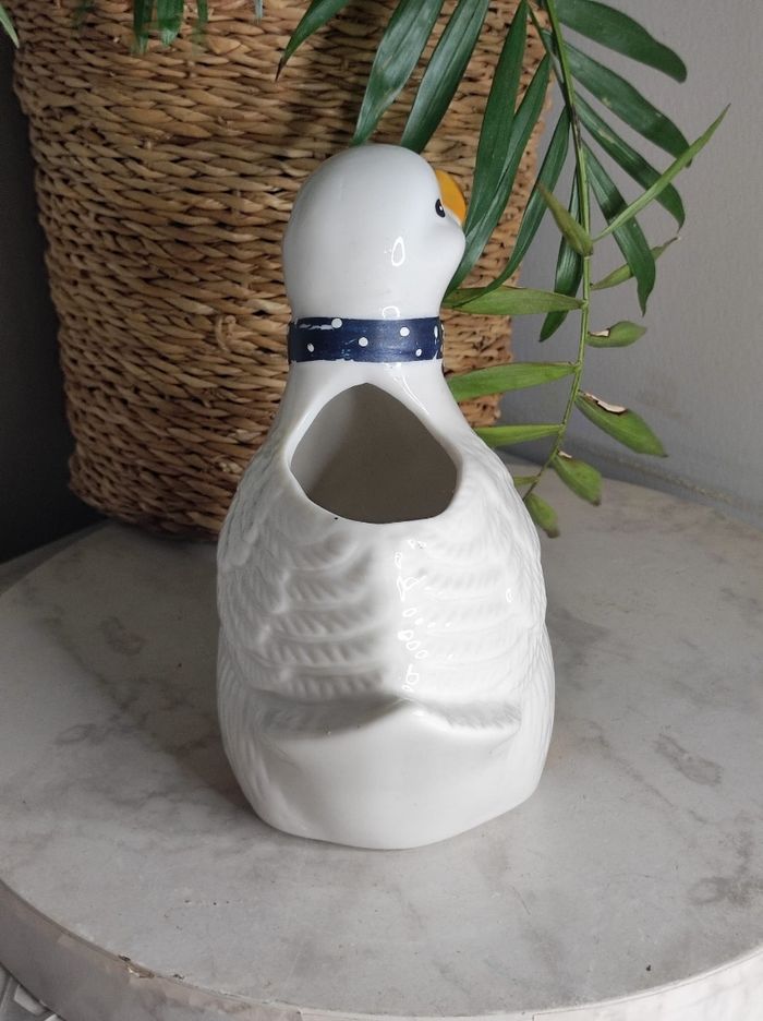 Ce pot à ustensiles en céramique blanche émaillée est un choix fonctionnel pour organiser vos outils de cuisine. Sa forme d'une petite oie avec nœud fait un accessoire à la fois pratique et décoratif. Idéal pour ranger vos cuillères, spatules et autres ustensiles. Datant des années 80 La peinture est quelques peu effacer par endroits ( état d'usage du temps ) Dimensions Hauteur 15.5 cm Largeur 8.5 cm