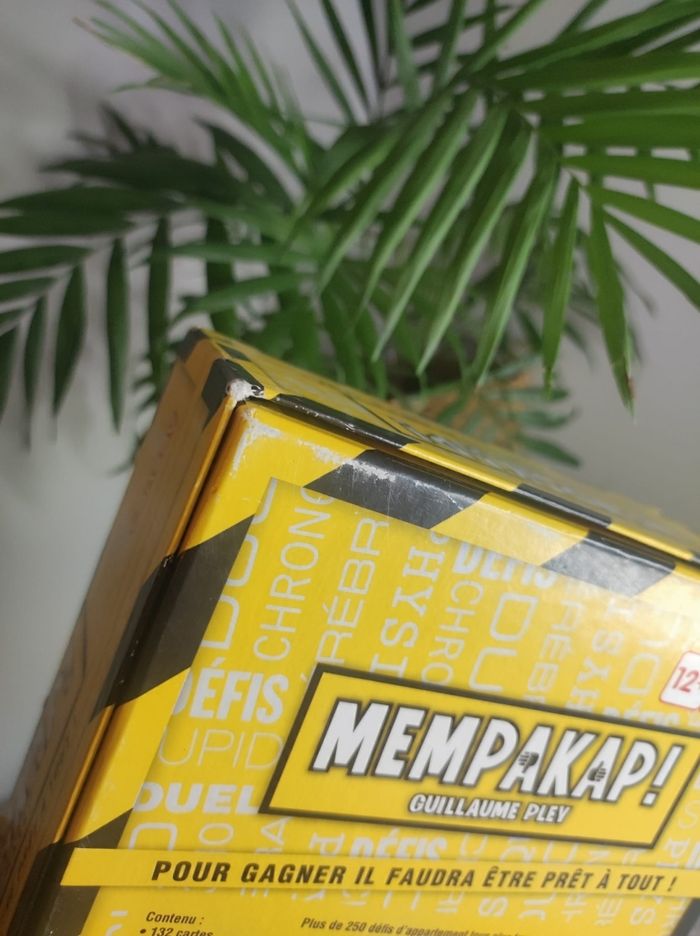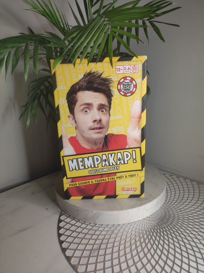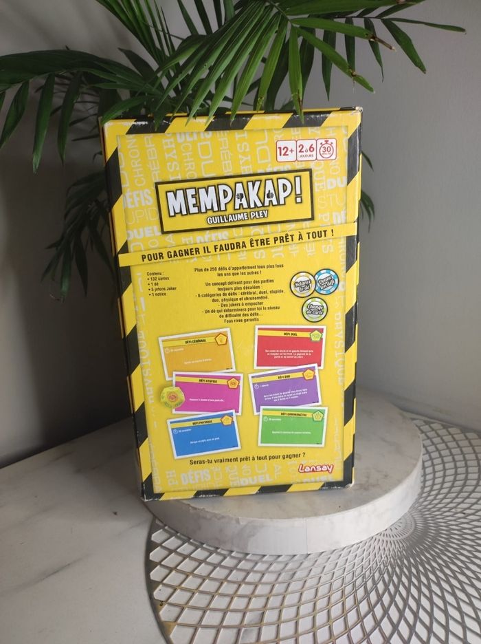 Jeu Mempakap de Lansay ! C'est un jeu amusant et interactif qui vous permettra de vous amuser pendant des heures. Avec plus de 250 défis, ce jeu vous tiendra en haleine et vous fera travailler votre esprit d'observation. Plusieurs types de défis ; chronométrer, dues, duo, stupide, physique ou cérébraux. À partir de 12 ans, ce jeu peut se jouer de 2 à 6 joueurs. La boîte a un état d'usures (cf photos )mais il est complet.