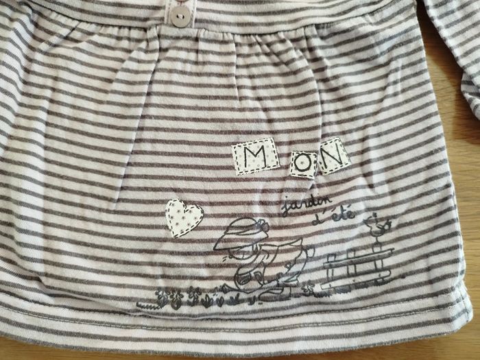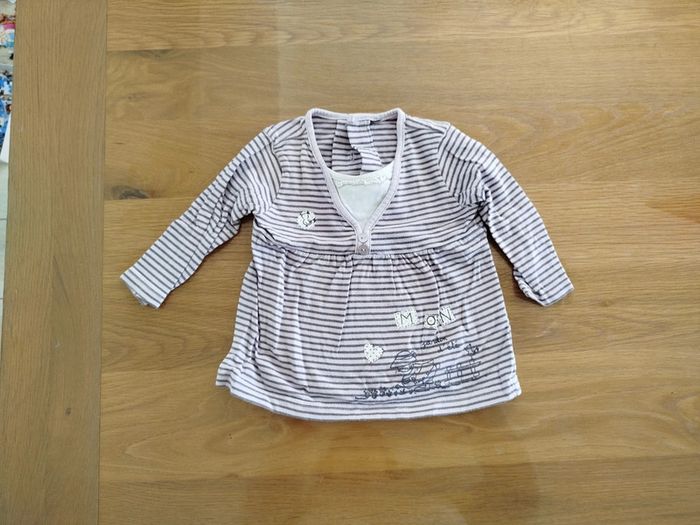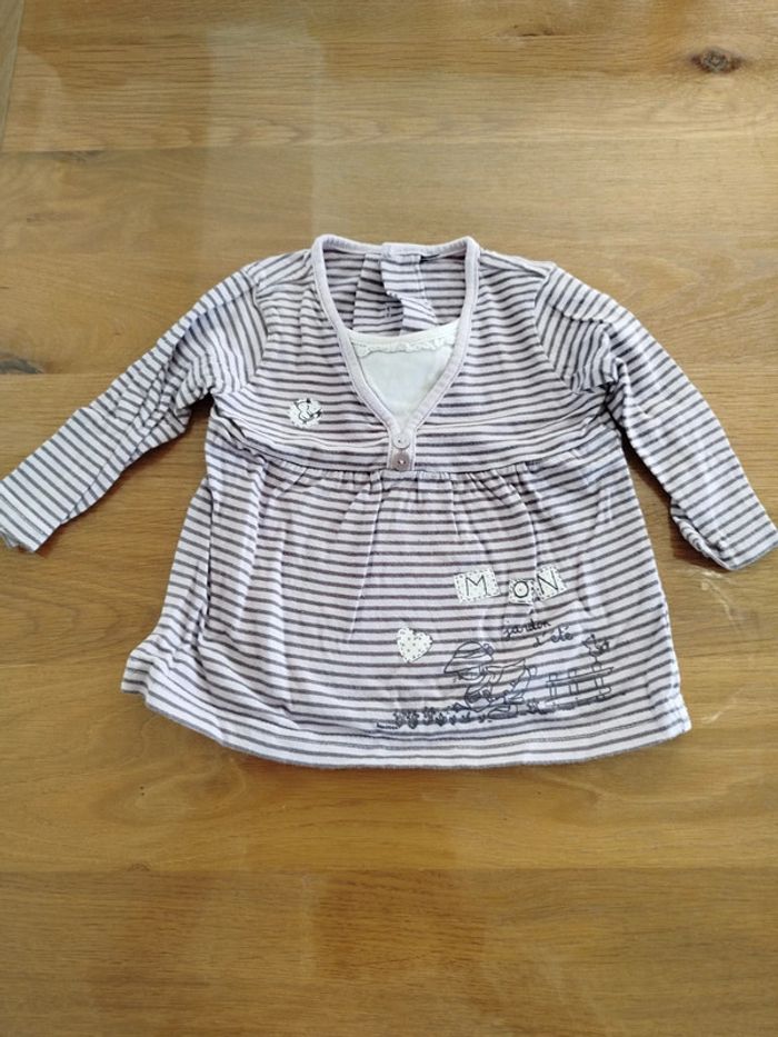 Tee-shirt à manches longues rayé violet avec illustration en bas. Marque inconnue, taille 12 mois (74cm). Réduction activée sur les lots. #fille #bébé #teeshirt #12mois #1an