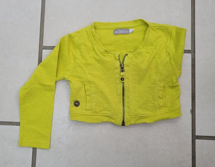 Gilet court zippé, de couleur jaune flashy, de la marque Boboli, taille 4 ans (104 cm), en très bon état. Article lavé pour la vente.