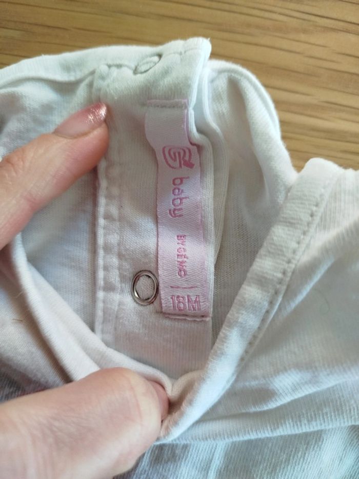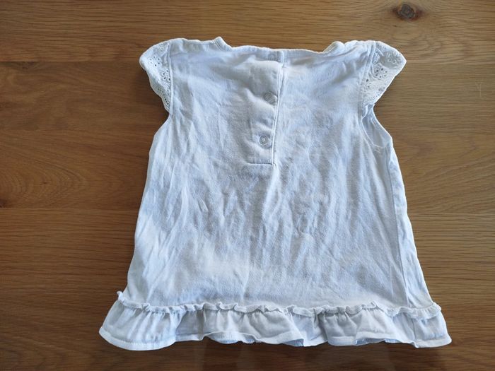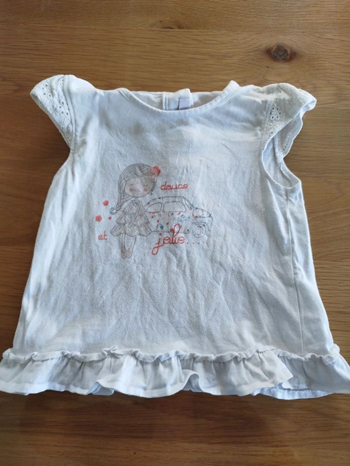 Tee-shirt à manches courtes blanc, illustration petite fille. Étiquette 18 mois, mais taille petit, de la même taille que les tee-shirts 12 mois. Marque Gémo. Réduction activée sur les lots. #bébé #fille #teeshirt #gemo #12mois #1an