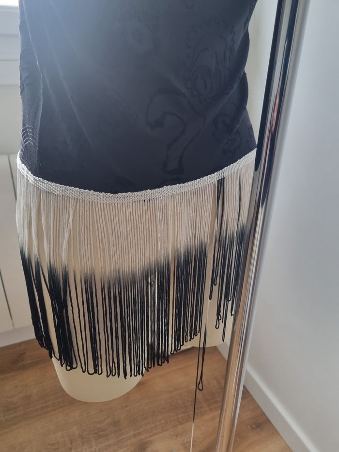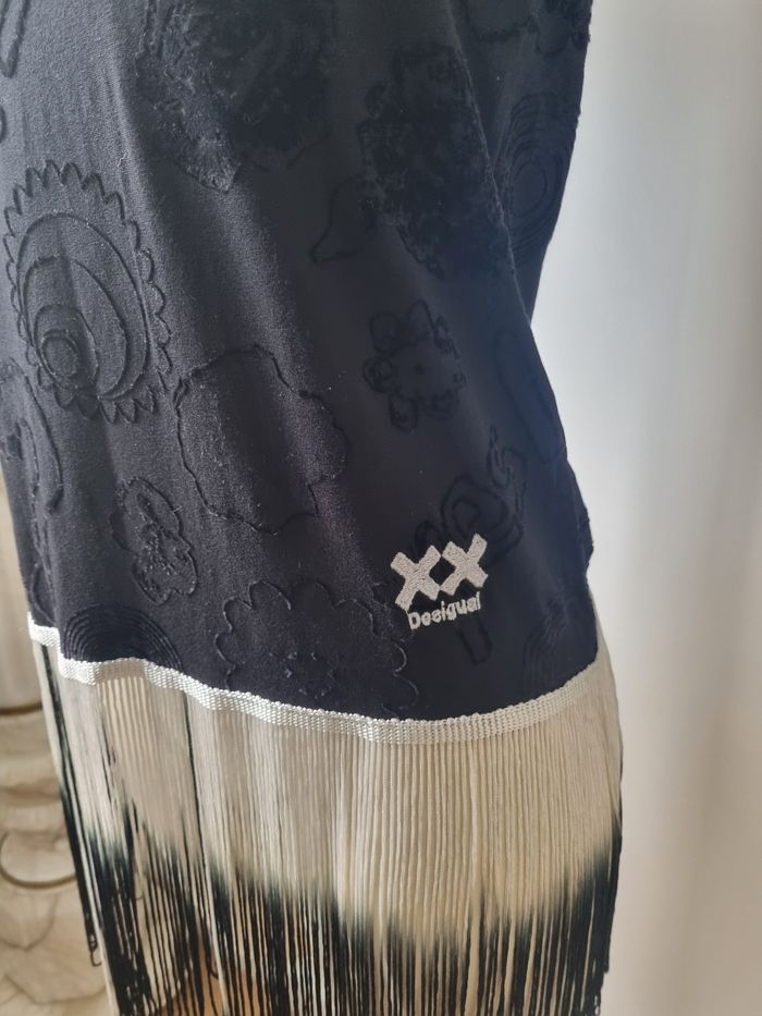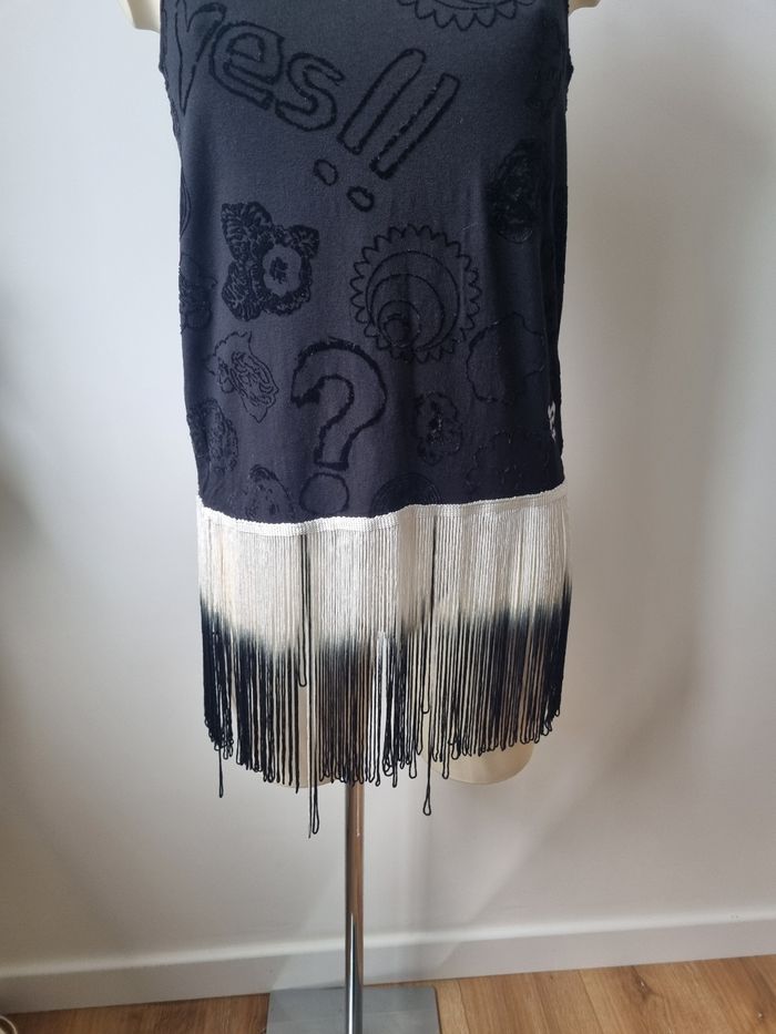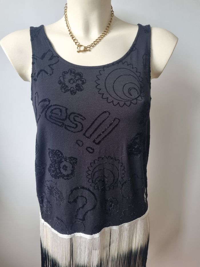 Magnifique débardeur de la marque Desigual Jolie motifs en velours Frange avec un jolie dégradé allant du blanc au noir En bon état Taille M Dimensions : - Largeur épaules : 36 cm - Largeur aiselles : 45 cm - Longueur avec les franges : 90 cm