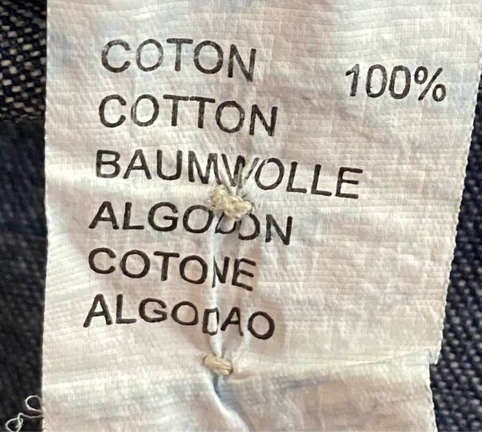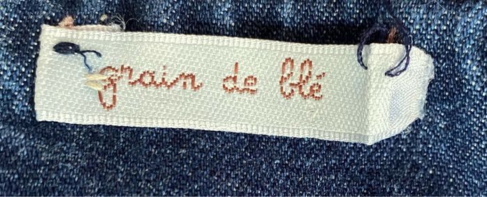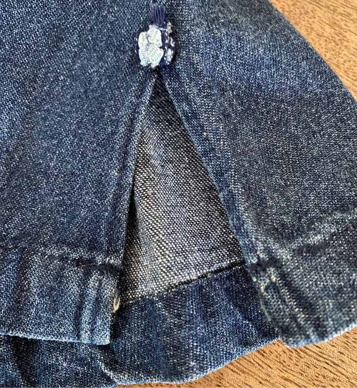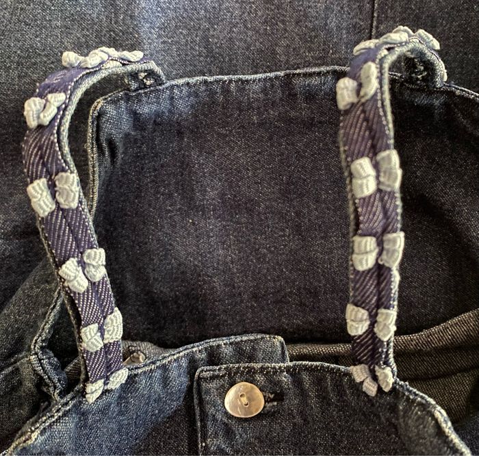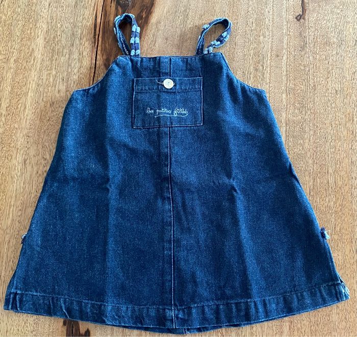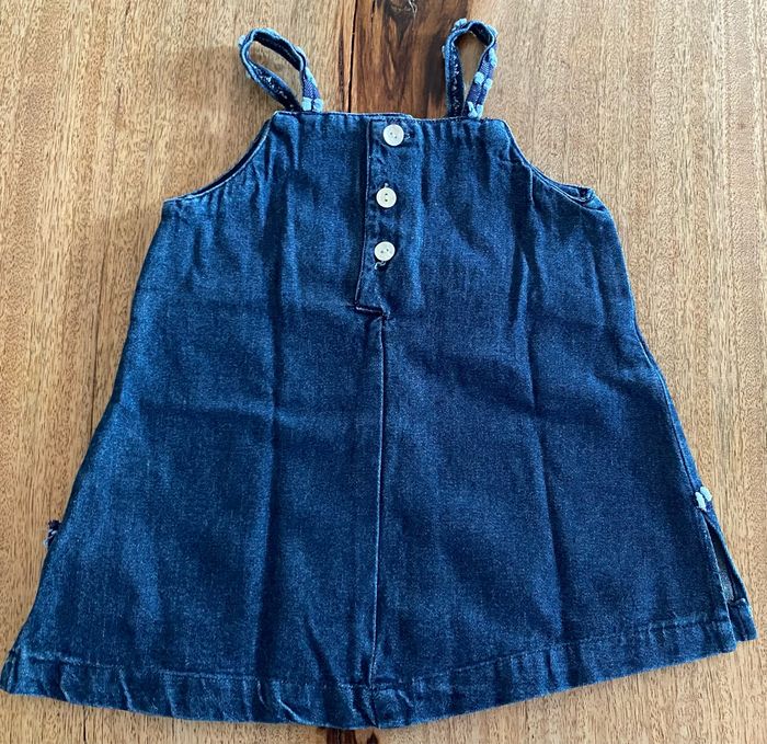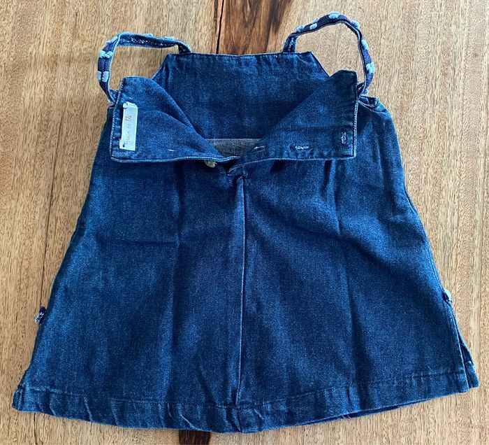 Robe en jean avec poche devant qui s’attache avec un petit bouton. Petite décoration sur les bretelles en forme de petits nœuds. Petit échancrure de chaque côté de la robe avec un petit rappel des petits nœuds qui sont sur les bretelles Détachable par l’arrière avec trois boutons. Sans taches 100 % coton