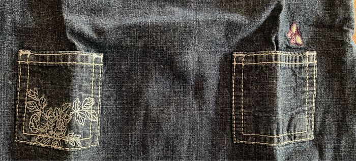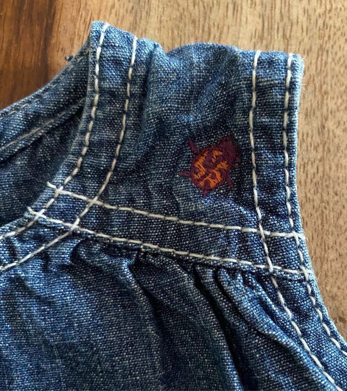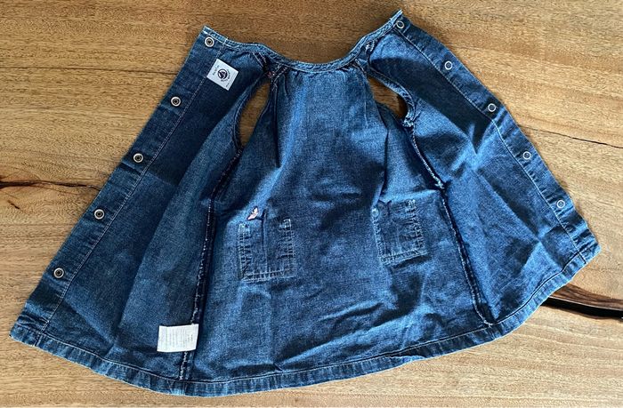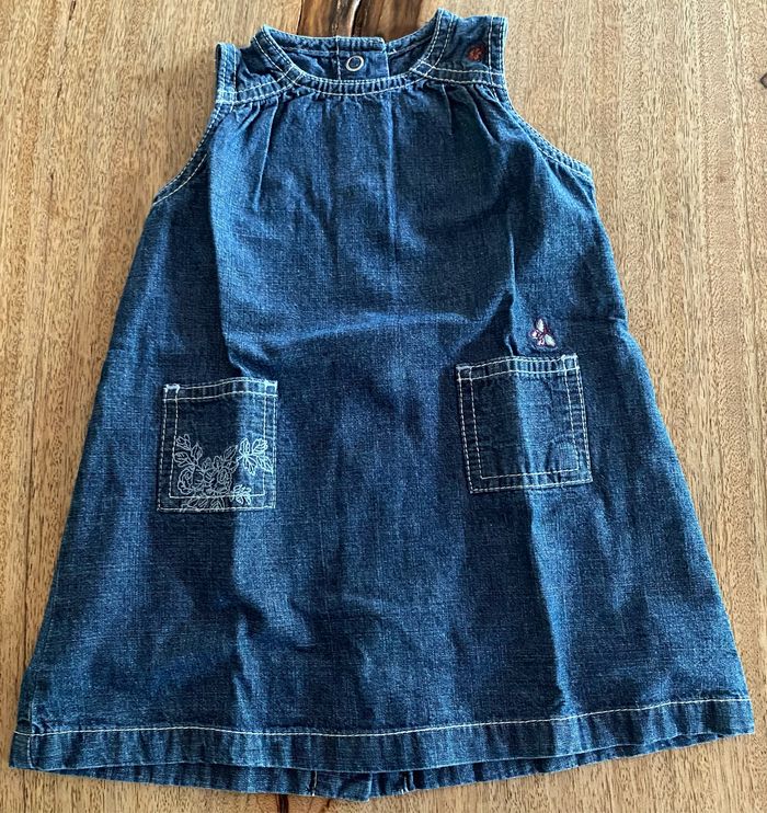 Robe en jean avec 2 petite poches devant, la poche de gauche à une petite broderie papillon et sur la poche de droite des fleurs brodé. Sur l’épaule gauche, une petite broderie qui représente une coccinelle. À l’arrière de la robe, 5 pression pour ouvrir la robe entière entièrement . Pas de taches 100 % coton