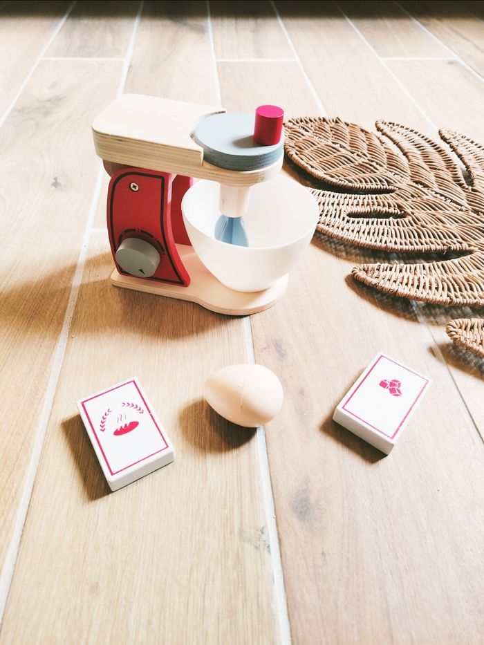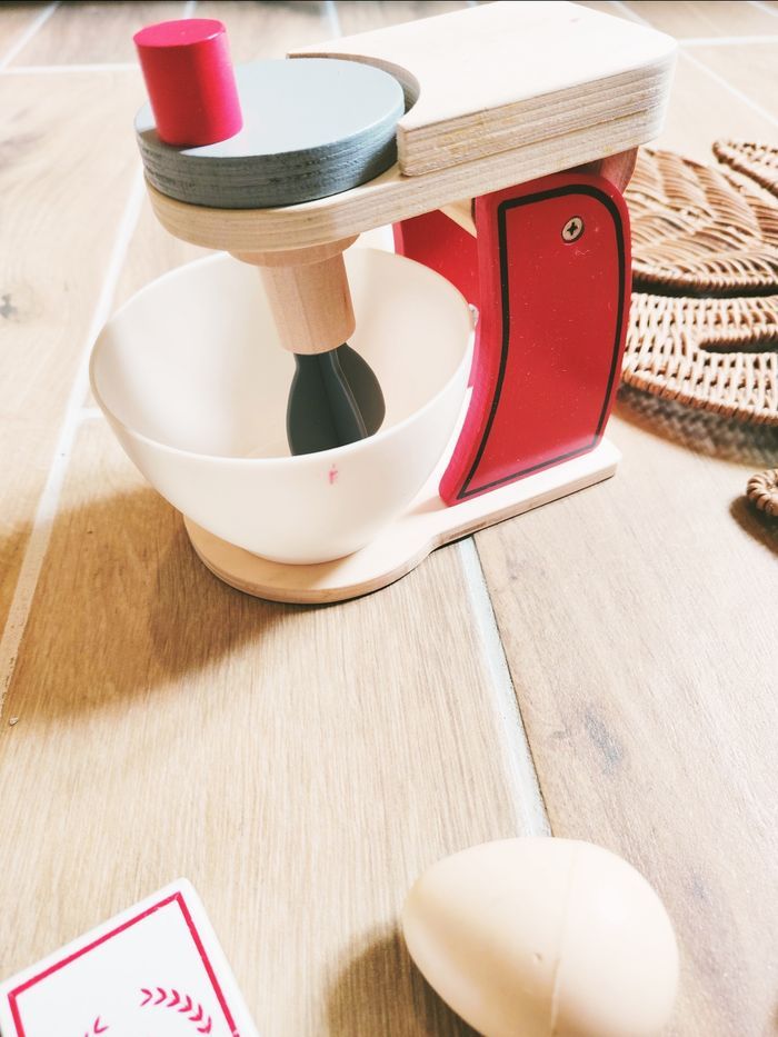 🥣Jeu d'imitation - Dinette en bois et plastique - Robot mixeur de cuisine et accessoires pâtisserie- JB593 🎀Convient dès l'âge de 3 ans 🎀Un adorable robot pâtissier d'imitation pour les petits chefs en herbe ! Ce jouet en bois est parfait pour développer l'imagination et reproduire les gestes des grands en cuisine 🎀 Le set comprend : ✨Robot Pâtissier : Mixeur rouge en bois avec bouton rotatif et fouet. ✨Bol de préparation : Un grand bol blanc amovible. ✨Ingrédients : Un œuf ainsi que deux paquets (farine et sucre) pour des recettes réalistes 🎀Jouet de seconde main pouvant comporter quelques petites traces ❇️N'hésitez pas à créer un lot pour économiser sur les frais de port❇️ Premier âge, Jouet bébé, Jouet d'activité, Jouet ludique, Jouet eveil, Mémorisation, Memoire, aptitude, motricité, jeu Adresse, Montessori, jeu bois, Jouet bois, Jouet vintage, Jeu adresse, jeu apprentissage, dextérité, jeu sensorielle, jeu educatif, activités et Jouet pour bébé, trier empiler, encastrer, jeux et jouets