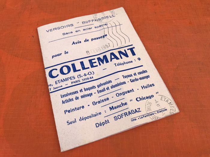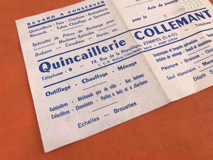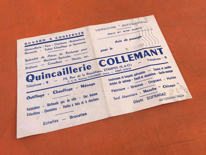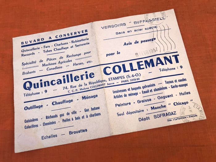 (article vendu en l' état, état d' usage voir toutes les photos) Buvard Février 1957 Quincaillerie Collemant Etampes (Essonne) Imprimerie La Familiale Etampes (210x140)mm Poids : 4grs