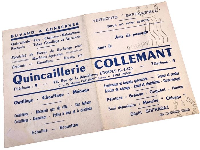 Buvard Février 1957 Quincaillerie Collemant Etampes (Essonne) Imprimerie La Familiale Etampes