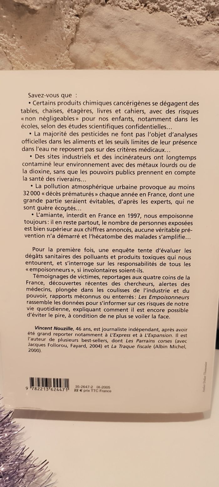Savez-vous que : Certains produits chimiques cancérigènes se dégagent des tables, chaises, étagères, livres et cahiers, avec des risques " non négligeables " pour nos enfants, notamment dans les écoles, selon des études scientifiques confidentielles... La majorité des pesticides ne font pas l'objet d'analyses officielles dans les aliments et les seuils limites de leur présence dans l'eau ne reposent pas sur des critères médicaux... Des sites industriels et des incinérateurs ont longtemps contaminé leur environnement avec des métaux lourds ou de la dioxine, sans que les pouvoirs publics prennent en compte la santé des riverains... La pollution atmosphérique urbaine provoque au moins 32 000 " décès prématurés " chaque année en France, dont une grande partie seraient évitables, d'après les experts, qui ne sont guère écoutés... L'amiante, interdit en France en 1997, nous empoisonne toujours : il en reste partout, le nombre de personnes exposées est bien supérieur aux chiffres annoncés, aucune véritable prévention n'a démarré et l'hécatombe des malades s'amplifie... Pour la première fois, une enquête tente d'évaluer les dégâts sanitaires des polluants et produits toxiques qui nous entourent, et s'interroge sur les responsabilités de tous les " empoisonneurs ", si involontaires soient-ils. Témoignages de victimes, reportages aux quatre coins de la France, découvertes récentes des chercheurs, alertes des médecins, plongée dans les coulisses de l'industrie et du pouvoir, rapports méconnus ou enterrés : Les Empoisonneurs rassemble les données pour s'informer sur ces risques de notre vie quotidienne, expliquant comment il est encore possible d'éviter le pire, à condition de ne plus se voiler la face.