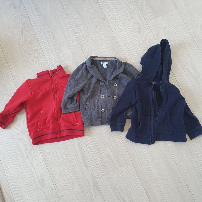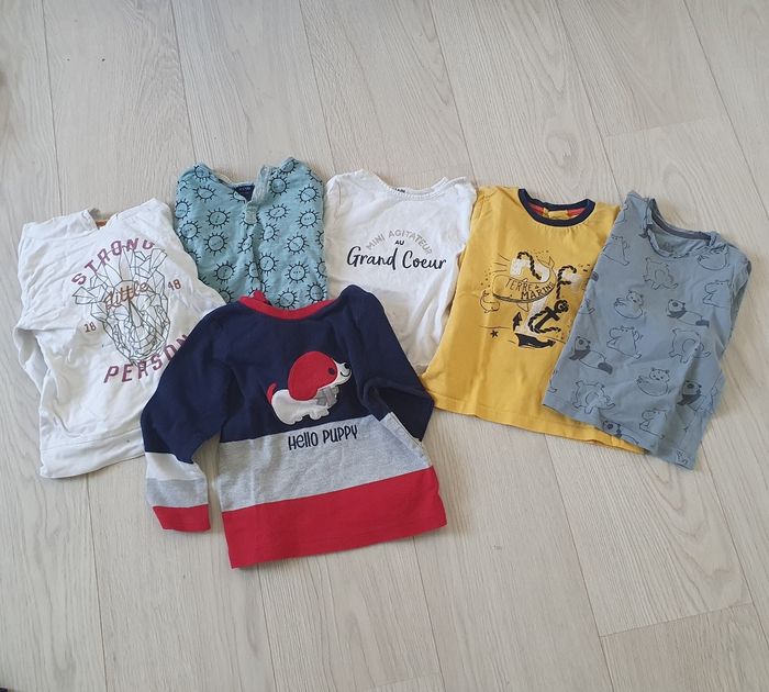 Gros lot vêtement 24 mois comprenant : 8 pantalons 1 salopette 6 t shirt manches longues 8 t shirt manches courtes 3 sweat (1 un peu taché voir photo) 3 gilets 2 jogging (1 un peu usé sur les genoux) 1 veste impermeable 1 manteau (manque doublure polaire) 1 combi de Ski en 3 ans