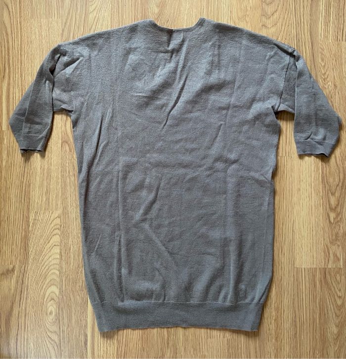 Pull taupe avec encolure strassée noire Col V Manches 3/4 Matière douce et agréable 50% laine 50% acrylique Longueur 66 cm