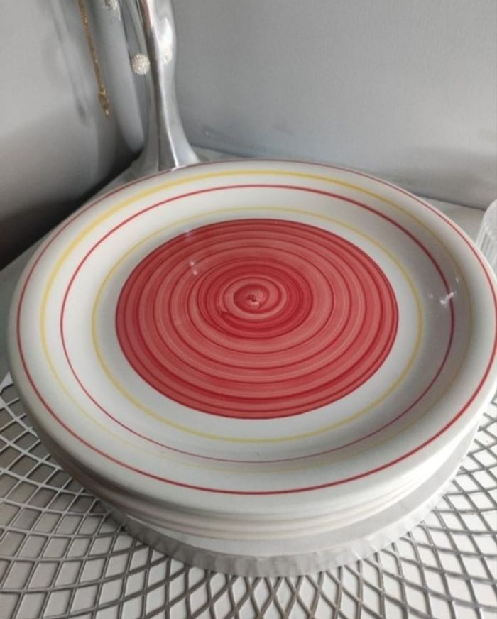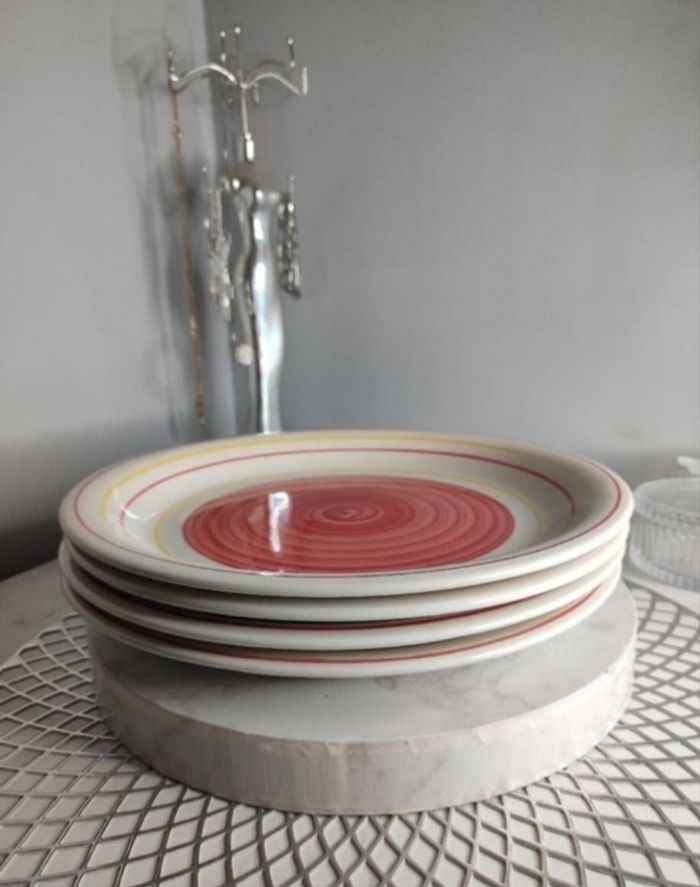 4 assiettes plates en céramique de 27cm de diamètre Effets tourbillon au centre et lignes colorés aux bords. Quelques traces d'usage sur le fond, ni fêlures ou ebruchures.