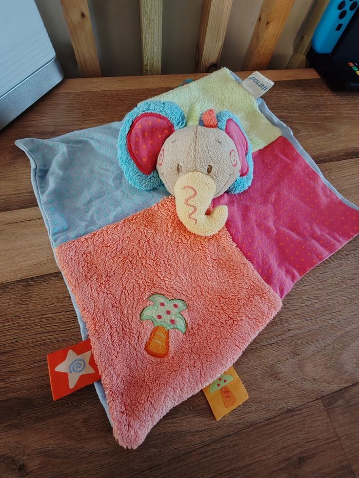 Doudou plat éléphant NATTOU Oasis palmier bleu rouge orange vert 25 cm environ Bon état Étiquette marque présente 14.90 Envoi en relais