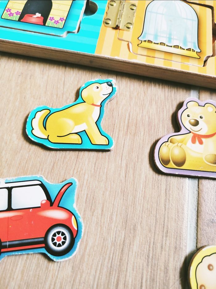 ✨Interactif : Le tableau est magnétique. L'enfant doit placer la bonne figurine (vache, chien, gâteau, etc.) dans la case correspondante (grange, niche, four...).