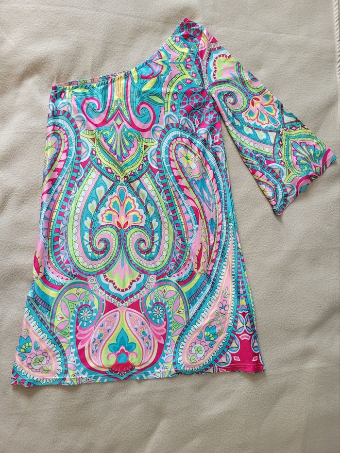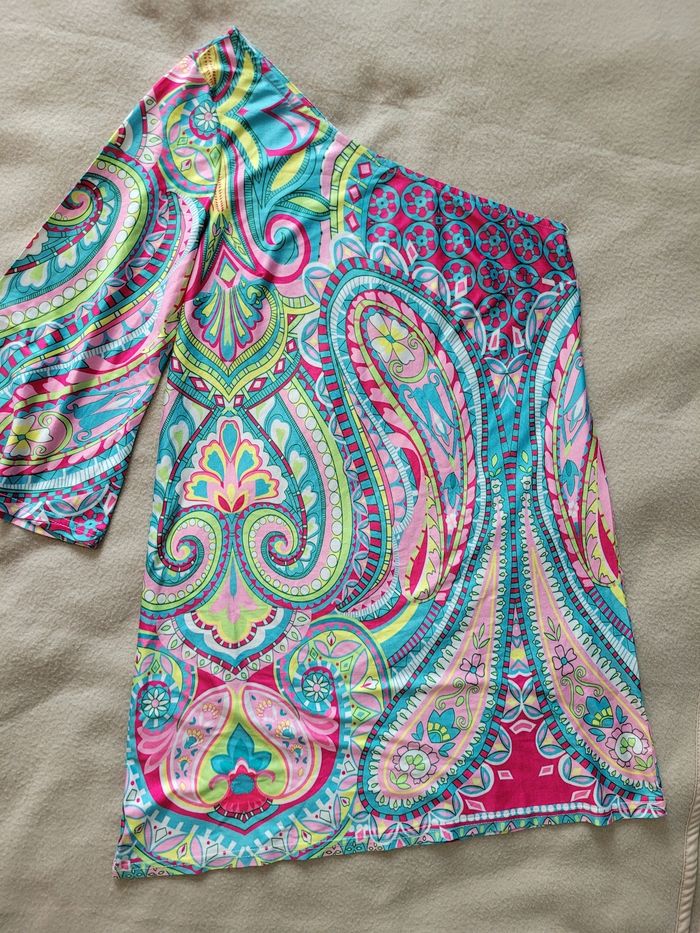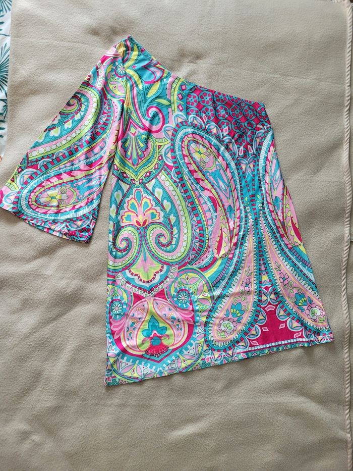 Top asymétrique coloré M En très bon état Absence d'étiquette Largeur aisselle 42 cm Longueur à partir de l'épaule 86 cm Longueur à partir de l'aisselle 64 cm Une épaule dénudée l'autre manche 3/4 Matière fluide et coupe évasée, couvre bien en Longueur Taille estimé M, mais peut convenir à S oversize ou petit L ajusté