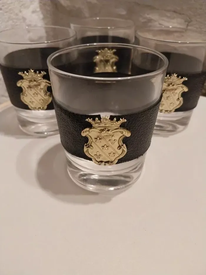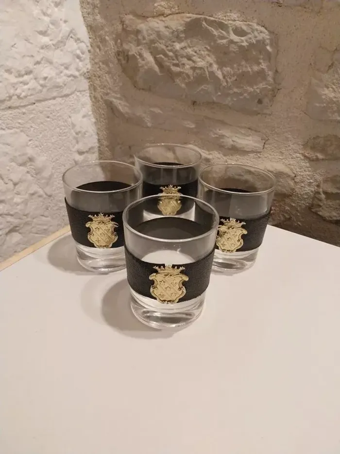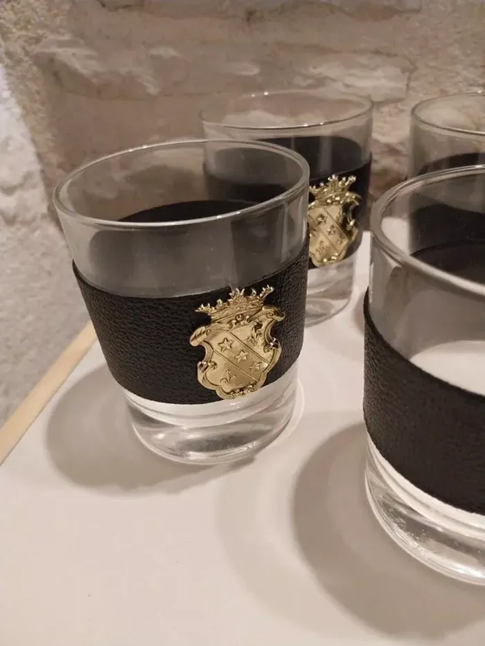 Nous mettons en vente ce lot de 4 magnifiques verres.Verres avec bandeaux imitation cuir et emblèmes.Les bandeaux peuvent êtres retiré ce qui permet de laver les verres en machine ou à la main.Verres pour apéritif ou tout autre consommation courante.
