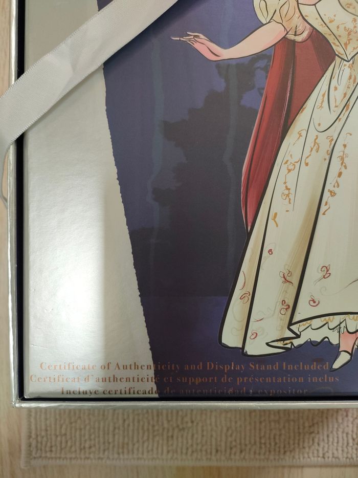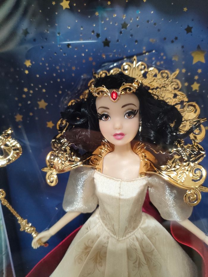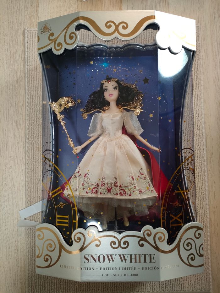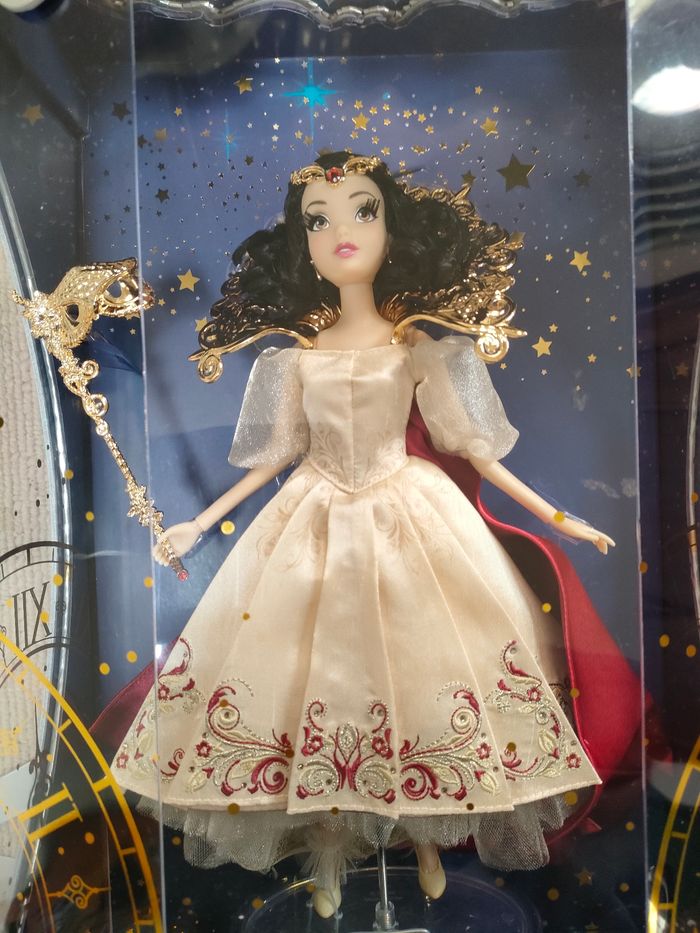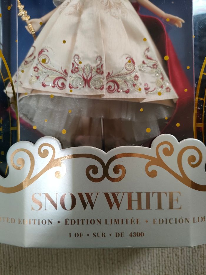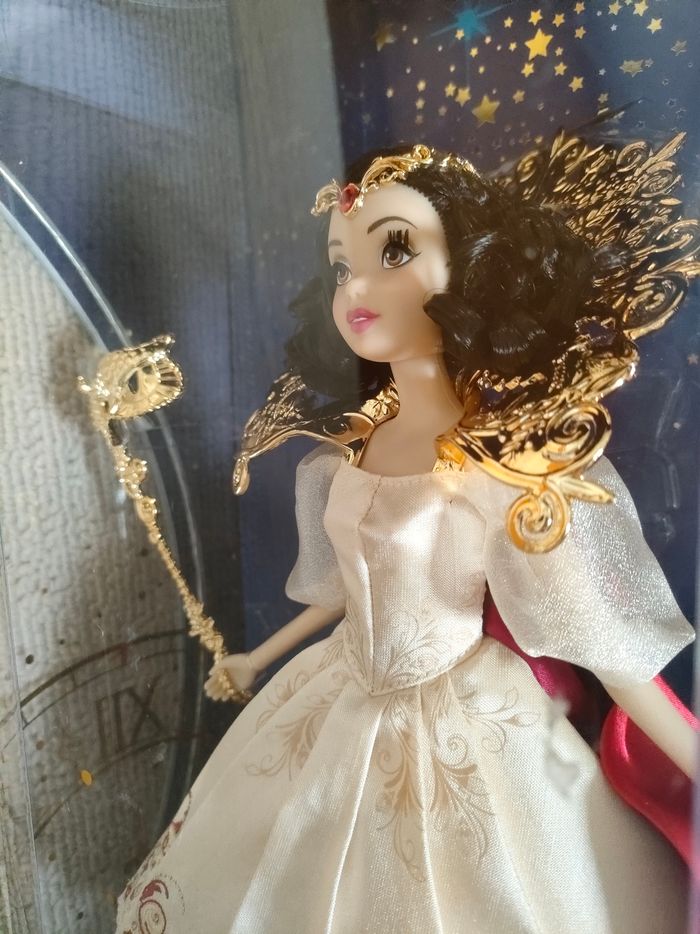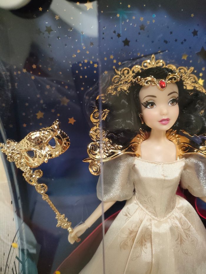 Poupée Blanche Neige Fashionably Late Midnight Masquerade Series Disney Designer Collection en édition limitée, Blanche Neige et les Sept Nains 10e sur 4300. Produit inspiré de Blanche Neige et les Sept Nains (1937) Édition limitée à 4300 pièces Certificat d'authenticité inclus Fashionably Late – Midnight Masquerade Series Disney Designer Collection Poupée Blanche Neige à collectionner Nombreux détails Produit articulé Corsage et jupe en brocart factice Manches bouffantes transparentes et brillantes Surjupe en mousseline avec filigrane brodé et strass à facettes Jupon en satin avec bordures en dentelle dorés Crinoline transparente dorée et froncée avec tours de cheville assortis Cape en satin rouge Col montant avec filigrane doré Diadème doré avec pierre précieuse rouge rubis Masque à tige doré Chevelure réaliste Cils implantés Boucles d'oreille dorées Talons moulés à bride Socle inclus Présenté dans une boîte à fenêtre élégante fermée par des rubans avec poignée de transport Produit créé pour Disney Store Produit de la collection Disney Designer Fashionably Late – série Midnight Masquerade Poupée : H 30,5 cm environ (avec son col) Boîte : H 42,5 x l 27,5 x P 14,5 cm environ En PVC (polychlorure de vinyle), ABS (acrylonitrile butadiène styrène), PP (polypropylène), polyester et métal