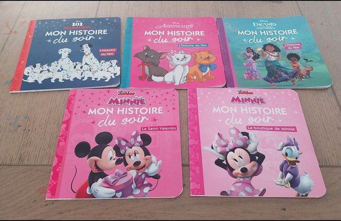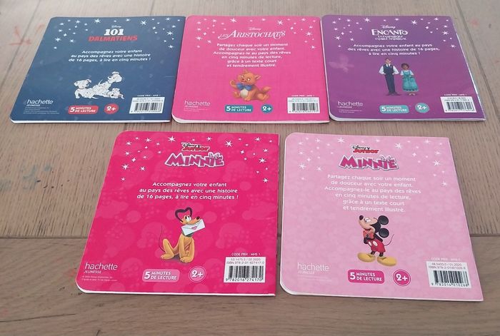 Lot de 5 petits livres enfant en très bon état Pour la petite histoire du soir pour un petit enfant (Préconisé dès 2ans d après le livre) ⚠️ lot indissociable ⚠️ Titres : - 101 dalmatiens - les aristochats - encanto - minnie la saint Valentin - minnie la boutique Édition Hachette jeunesse