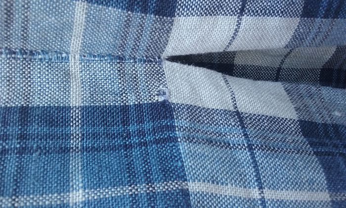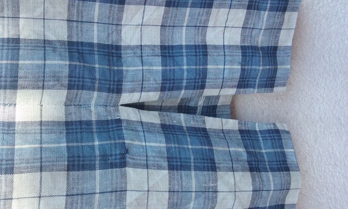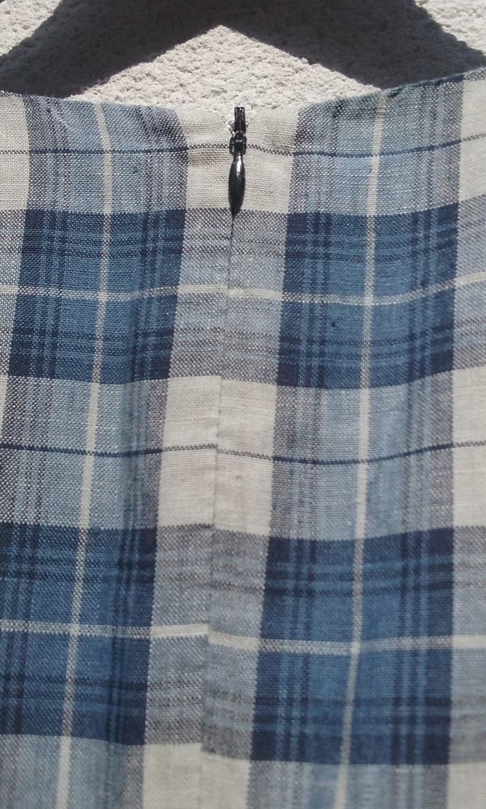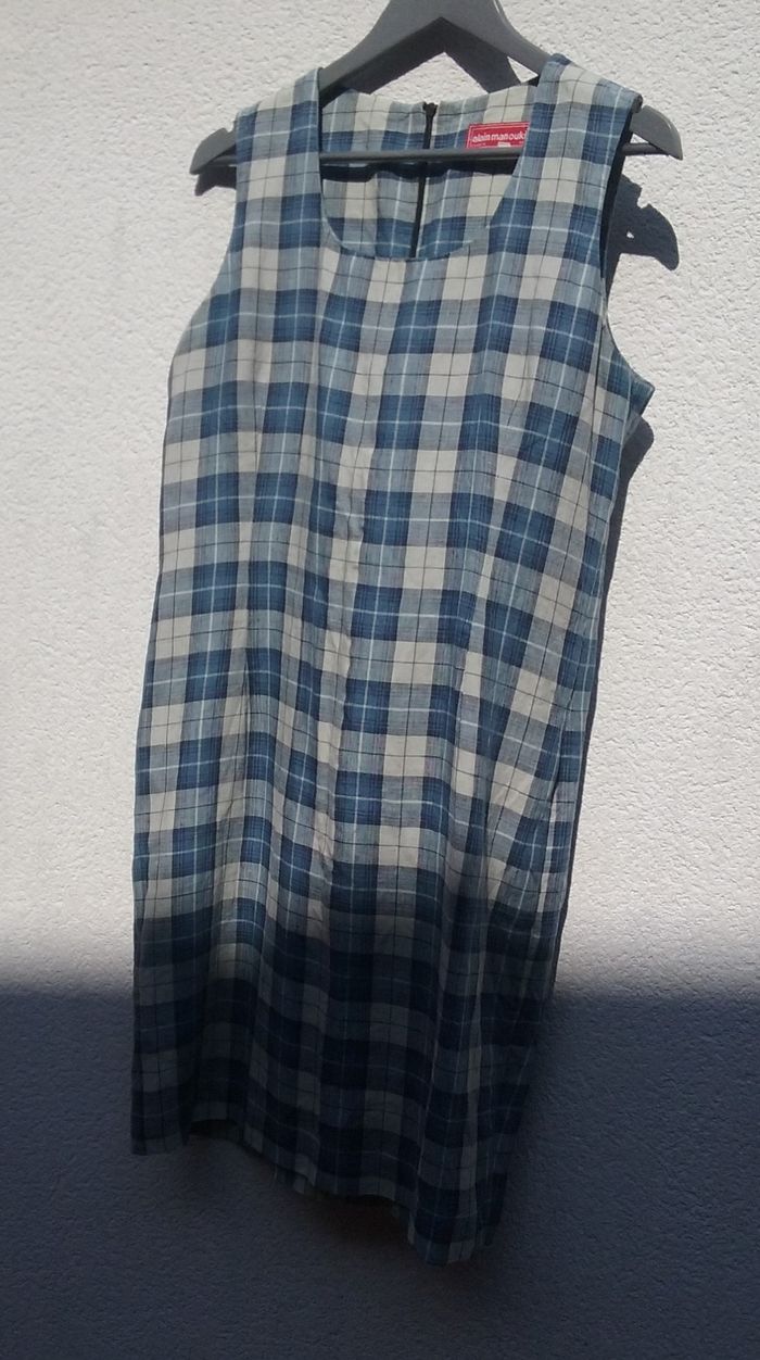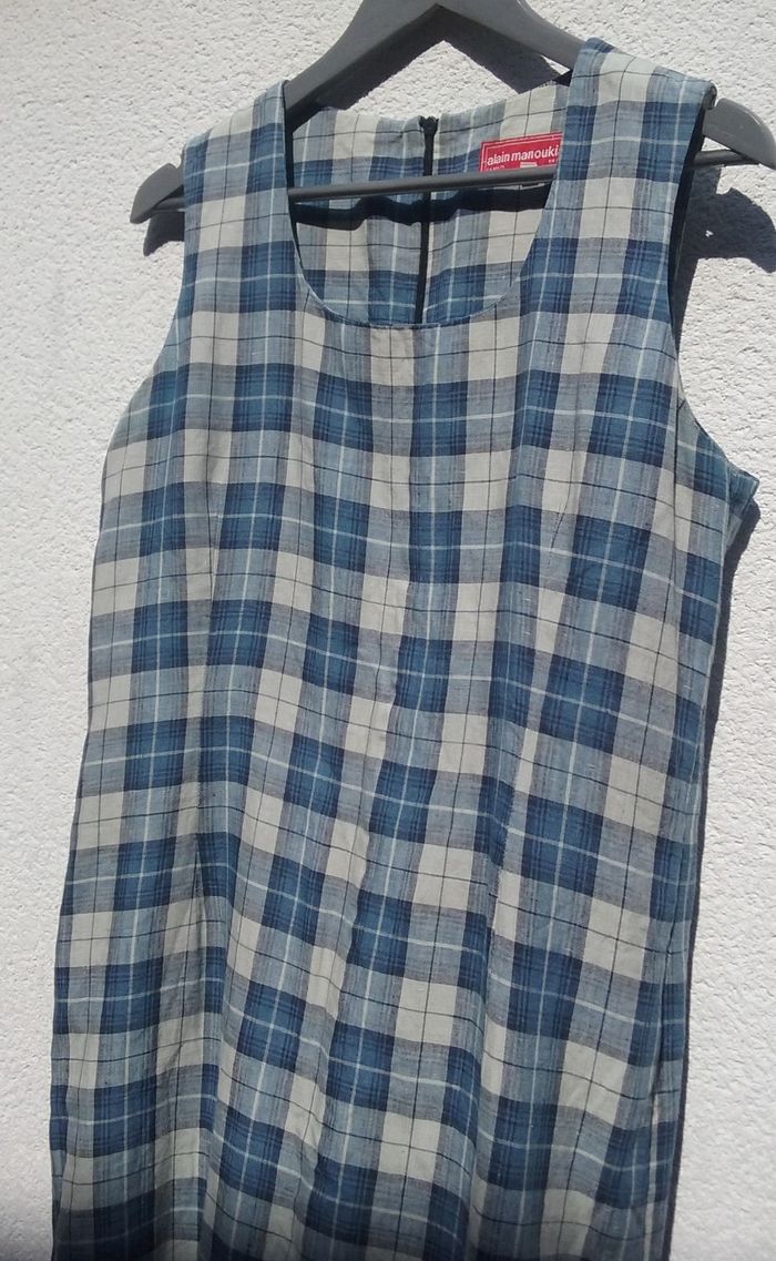 Fabrication française, 100% lin, fermeture zippée au dos, coloris bleus-gris-beige, attention 2 petits couacs au niveau de la fente arrière (cf 2 dernières photos)!