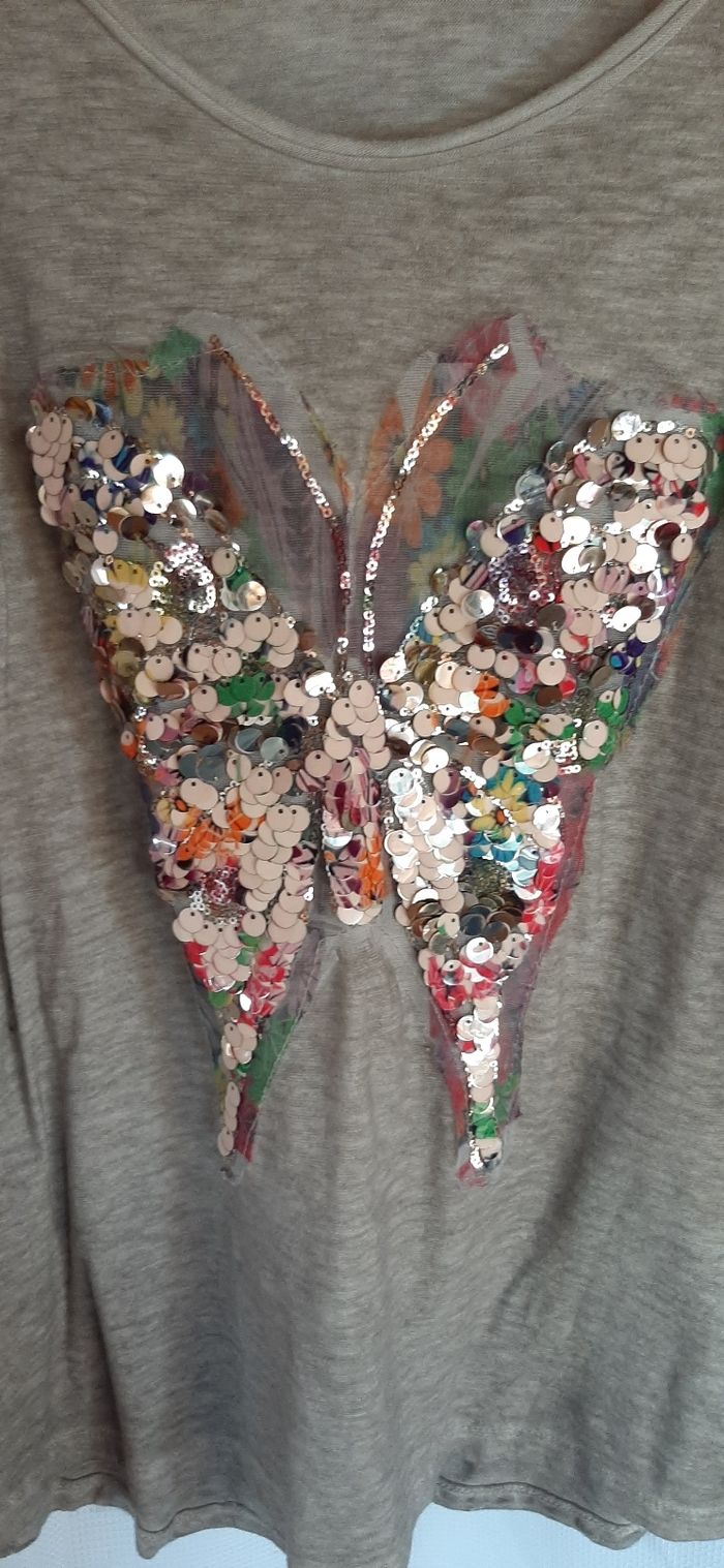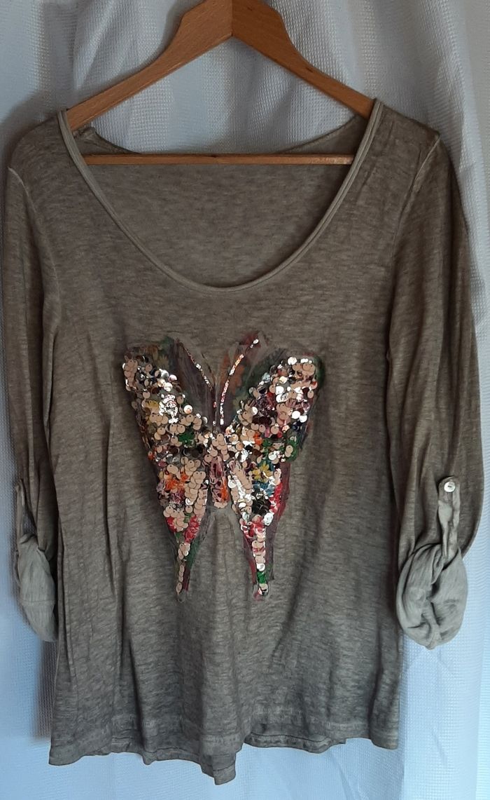 T-shirt à manches longues orné d'un papillon en sequins multicolores sur le devant. Les manches sont munies d'une patte de roulement pour un style décontracté.Parfait pour ajouter une touche de fantaisie à votre garde-robe.