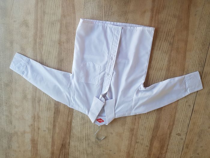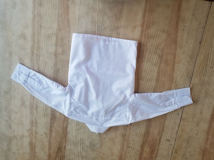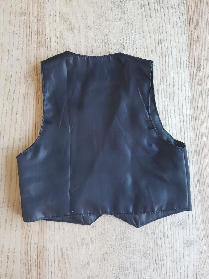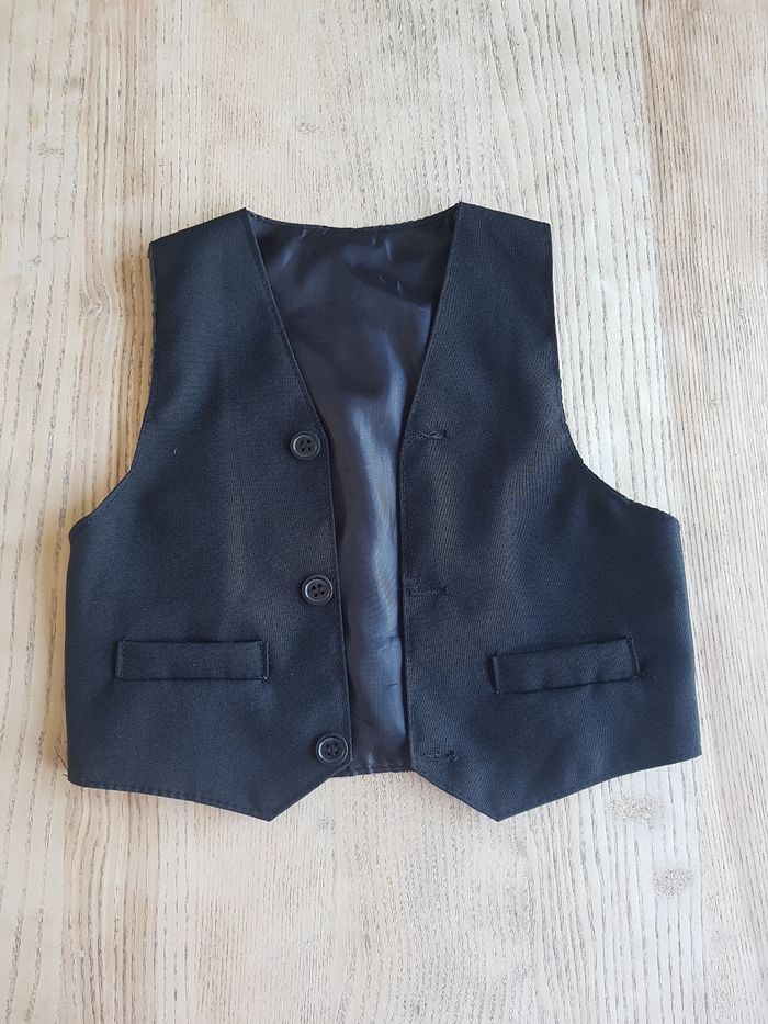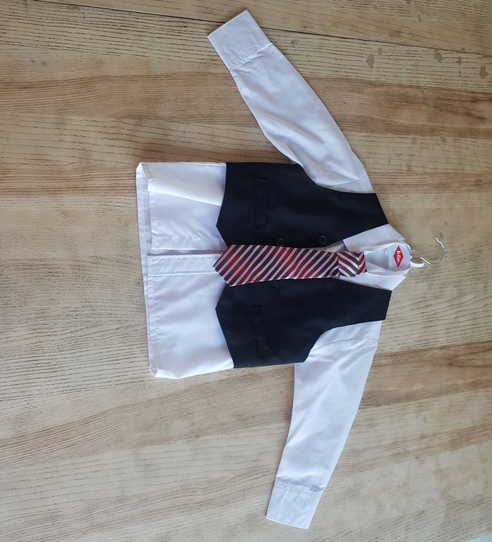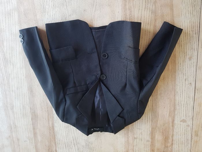 Complet noir garçon 2 ans comme les grands 😉 : Un pantalon noir, taille élastiquée et se ferme par un bouton. Une chemise manches longues. Un gilet noir sans manches. Une veste noire avec poches devant et boutons en bas des manches. Une cravate avec élastique pour ne pas serrer le cou.La cravate a un petit défaut "d'effilochage" derrière mais cela ne se voit pas quand elle est portée, cf photo avec mon doigts. Neuf, jamais porté. Marque H et Y. Taille 2 ans.