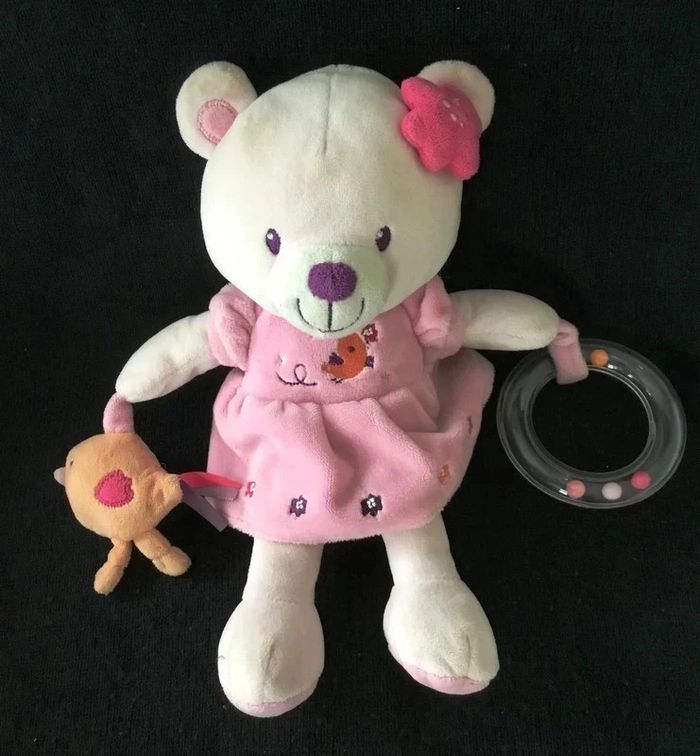 DOUDOU PELUCHE OURS EN VELOURS ROSE CLAIR AVEC FLEUR ROSE FONCE SUR LA TETE PETITE ROBE ROSE AVEC FLEURS DE COULEUR SUR LE BAS ET OISEAU BRODE SUR LE DEVANT A UNE MAIN EST ACCROCHE UN OISEAU ORANGE AVEC BRUIT DE POUET ET A L'AUTRE MAIN EST ACCROCHE UN ANNEAU AVEC BILLES DE COULEURS OURS QUI MESURE 25 CM ETAT NEUF !