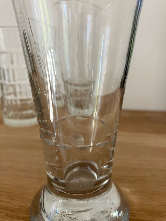 Vintage lot de 4 grands verres dépareillés Ils sont en bon état : ni ébréchée, ni fêlé Ce lot comporte : - 1 verre rond évasé pour le pastis (à noter un défaut dans le verre : voir photo) Diamètre : 6,5 cm/Hauteur : 14 cm - 1 verre à eau basse carrée diamètre : 6,5 cm/ hauteur : 14 cm - 1 verre rond base ciselée : diamètre : 6,5 cm / 14 cm - un verre complètement ciselé moins haut : 12 cm/ diamètre : 6,5 cm Pas de vente à l’unité