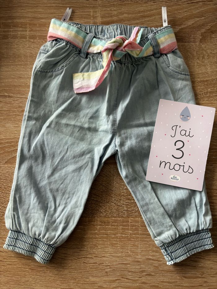 pantalon en jean bleu clair ZEEMAN taille 3 mois resserré à la cheville, ceinture à rayures vert/argenté/jaune/blanc/rose jamais était porté juste passé en machine #bébéfille #bebe3mois #printemps #été Retrouvez tous mes articles bébé : #ixfeelxinsanebebe3mois